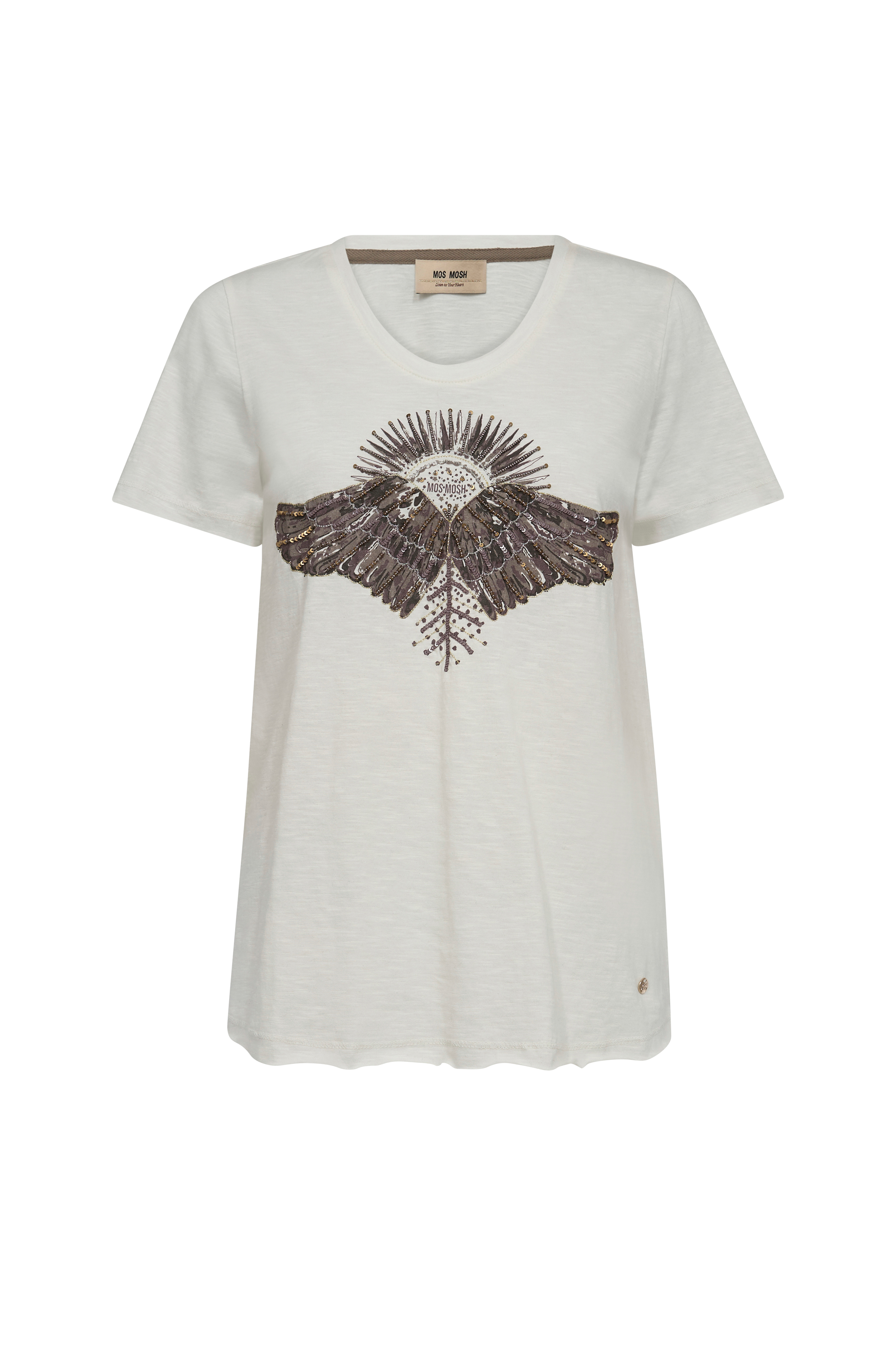 • Model i jersey• Tryk med Perlebroderi på brystet• Halsudskæring med lille ribkant• Kort ærme• Usømmede kanter nederst og ved manchetterne