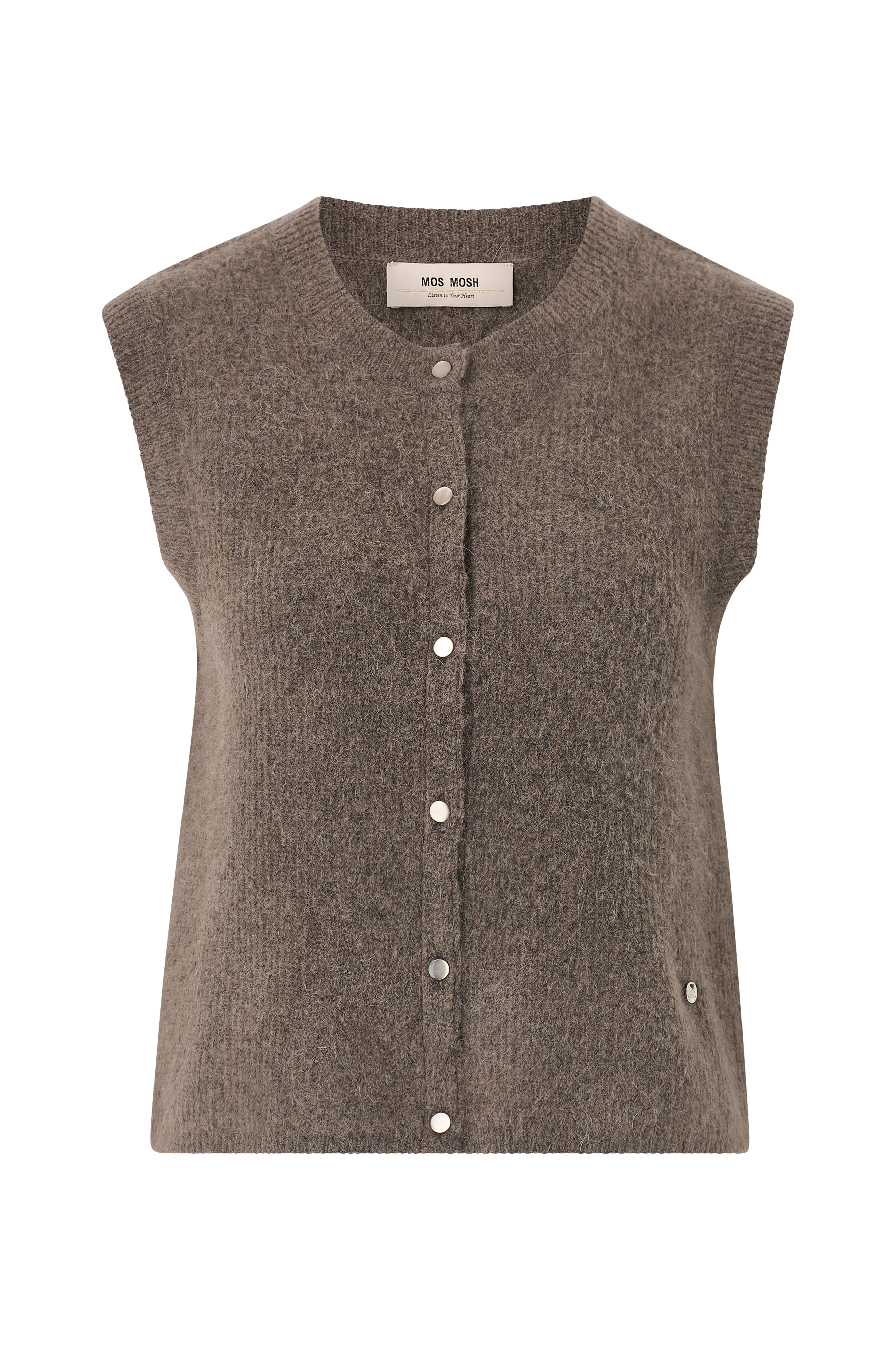 • Strikket vest med rund, ribbet halsudskæring• Blanke knapper foran• Ribstrik omkring ærmegabene