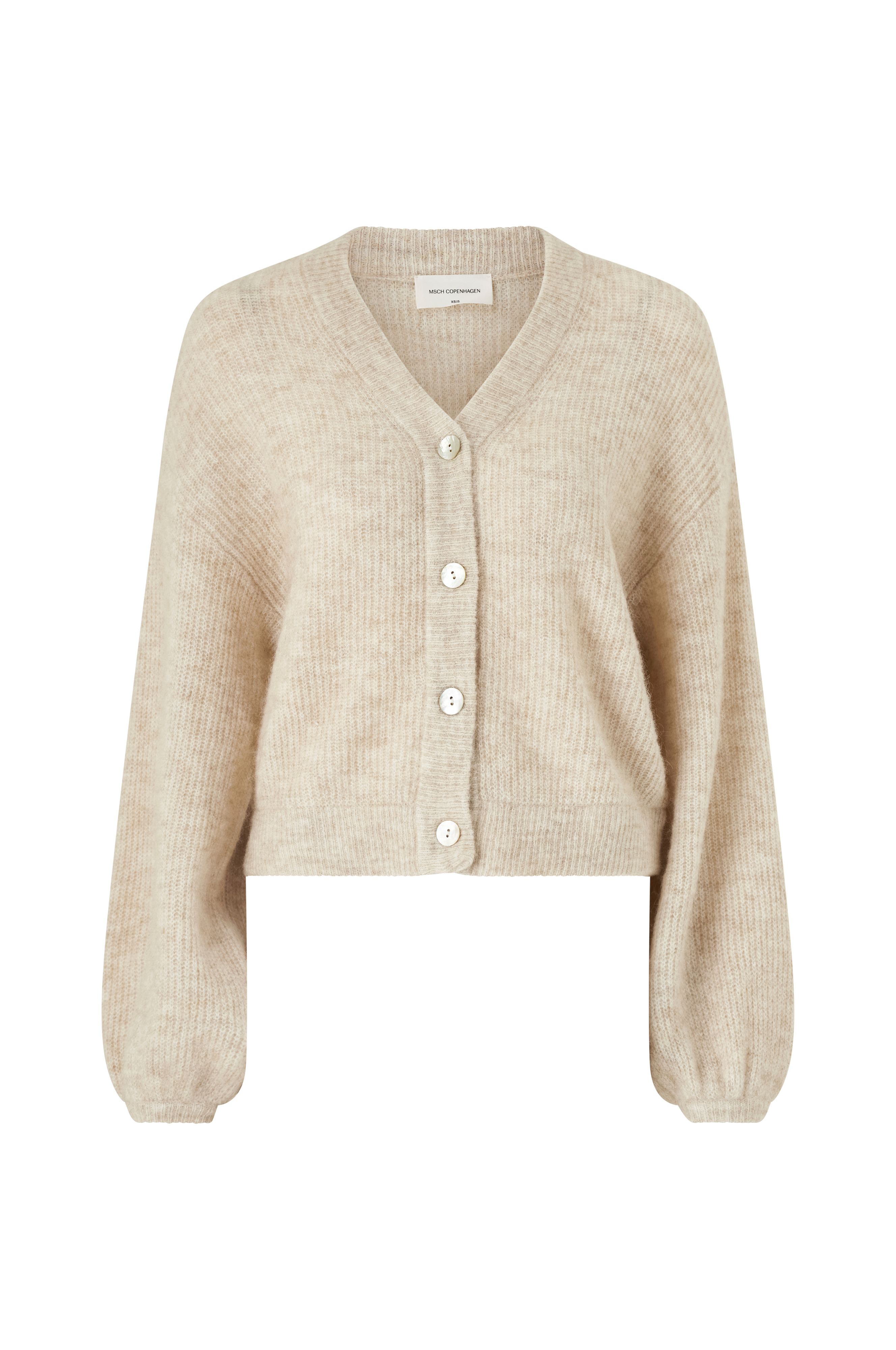 • Strikket cardigan i meget blød kvalitet med uld og alpaka• Løs pasform• V-udskæring• Knapper med perlemorslook• Nedsænkede skuldre• Ballonærmer• Ribstrik ved manchetterne og nederst