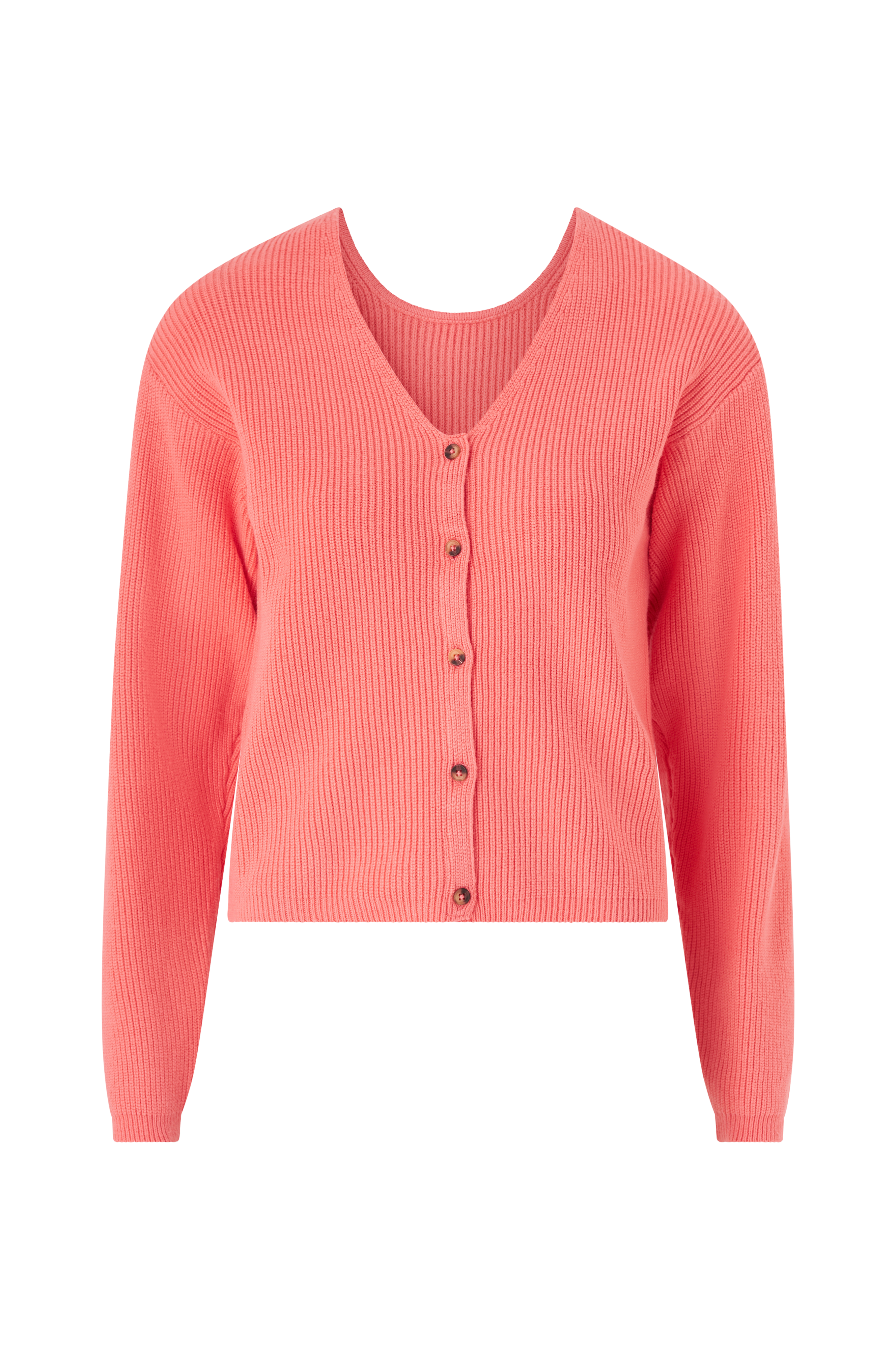 Cardigan af god kvalitet og med god holdning. Dejlig koralfarve, svarer til billedet.