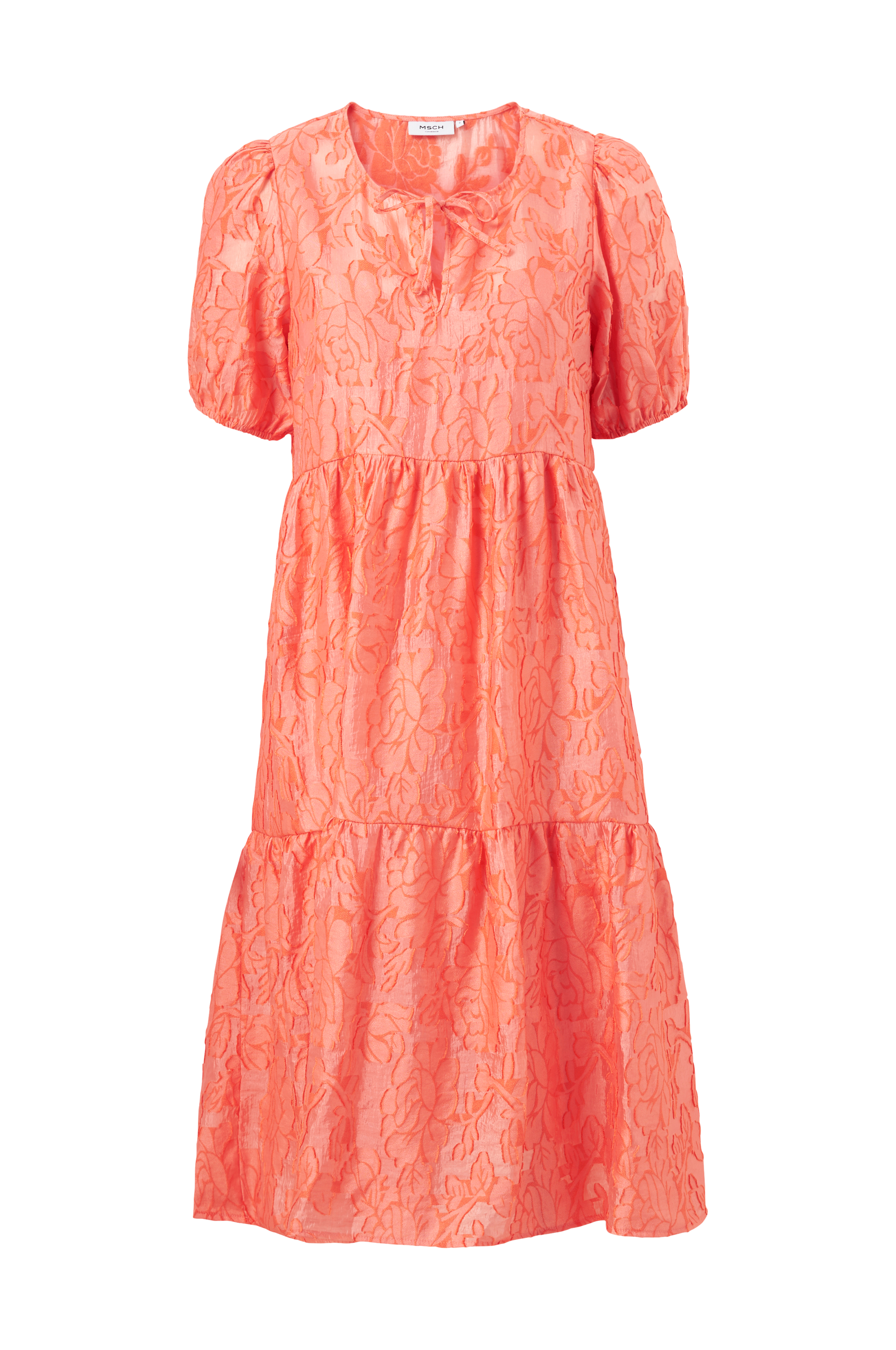 • Midikjole med svaj• Ventilation med bindebånd i halsen• Korte ballonærmer• Volant nederst• Jacquardmønster• Underkjole• Længde: 108 cm i størrelse S
