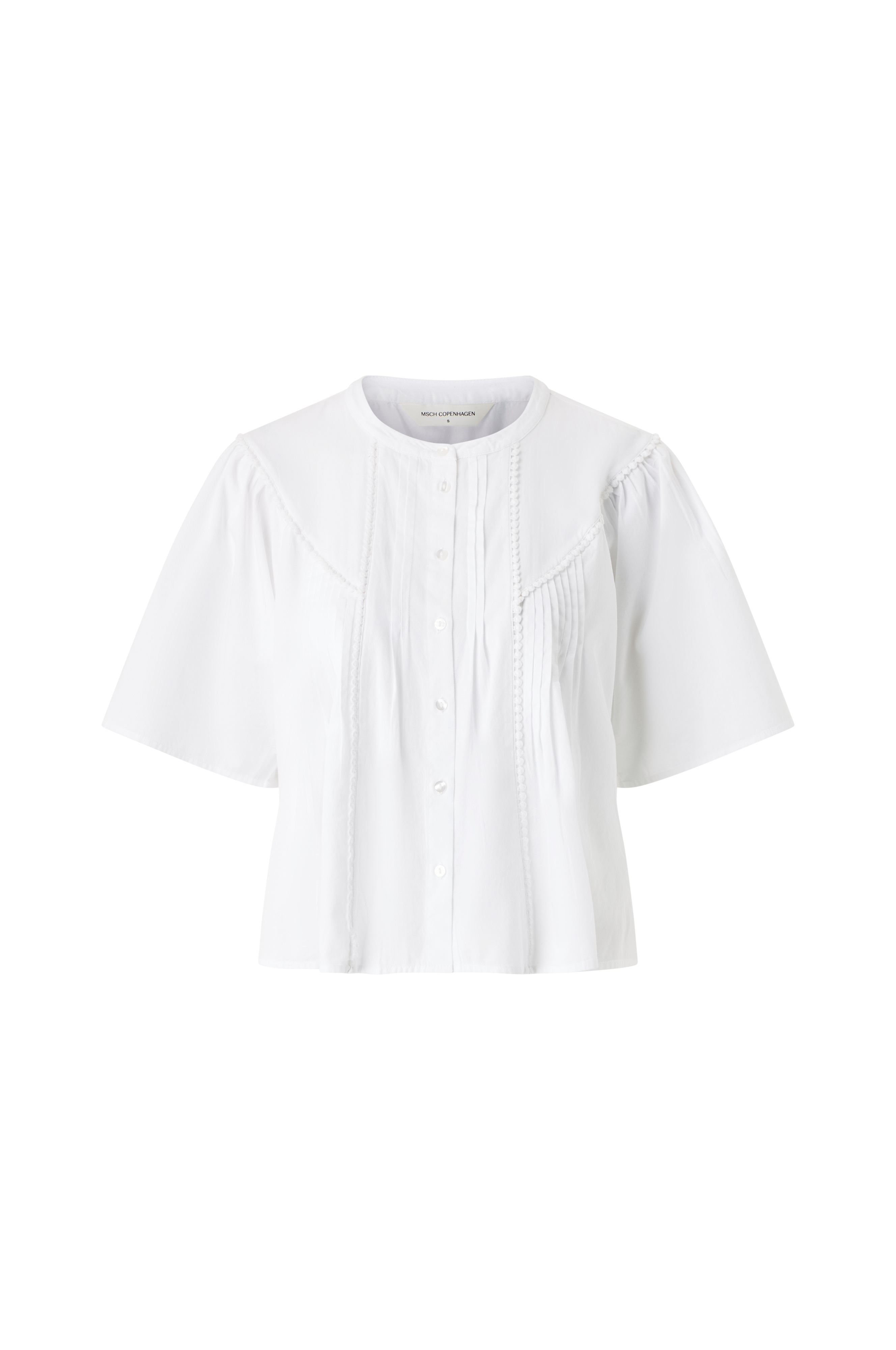 • Bluse i bomuld med korte, brede ærmer• Løs pasform• Rund halsudskæring• Samling omkring skuldrene• Knapper foran• Plisserede og broderede detaljer hele vejen rundt