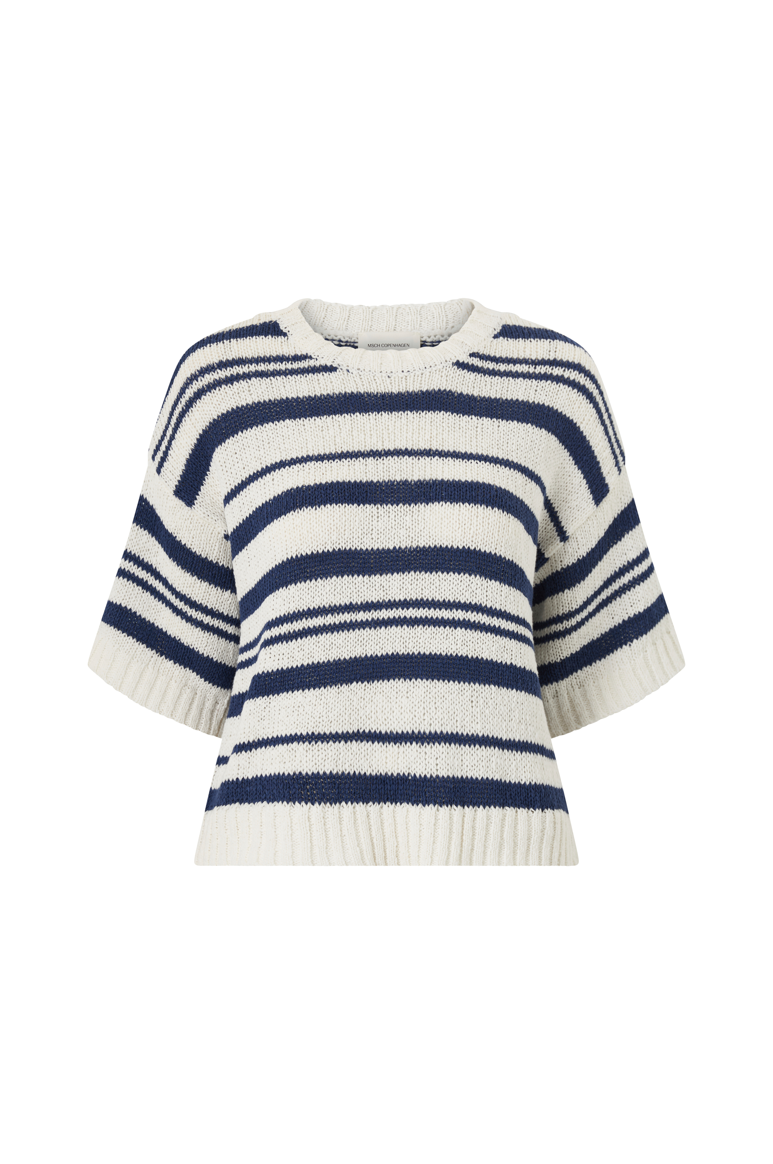 • Løststrikket Pullover med rund halsudskæring• Nedsænkede skuldre med korte ærmer• Ribstrik på halsen, ved ærmeafslutningerne og ved nederste kant