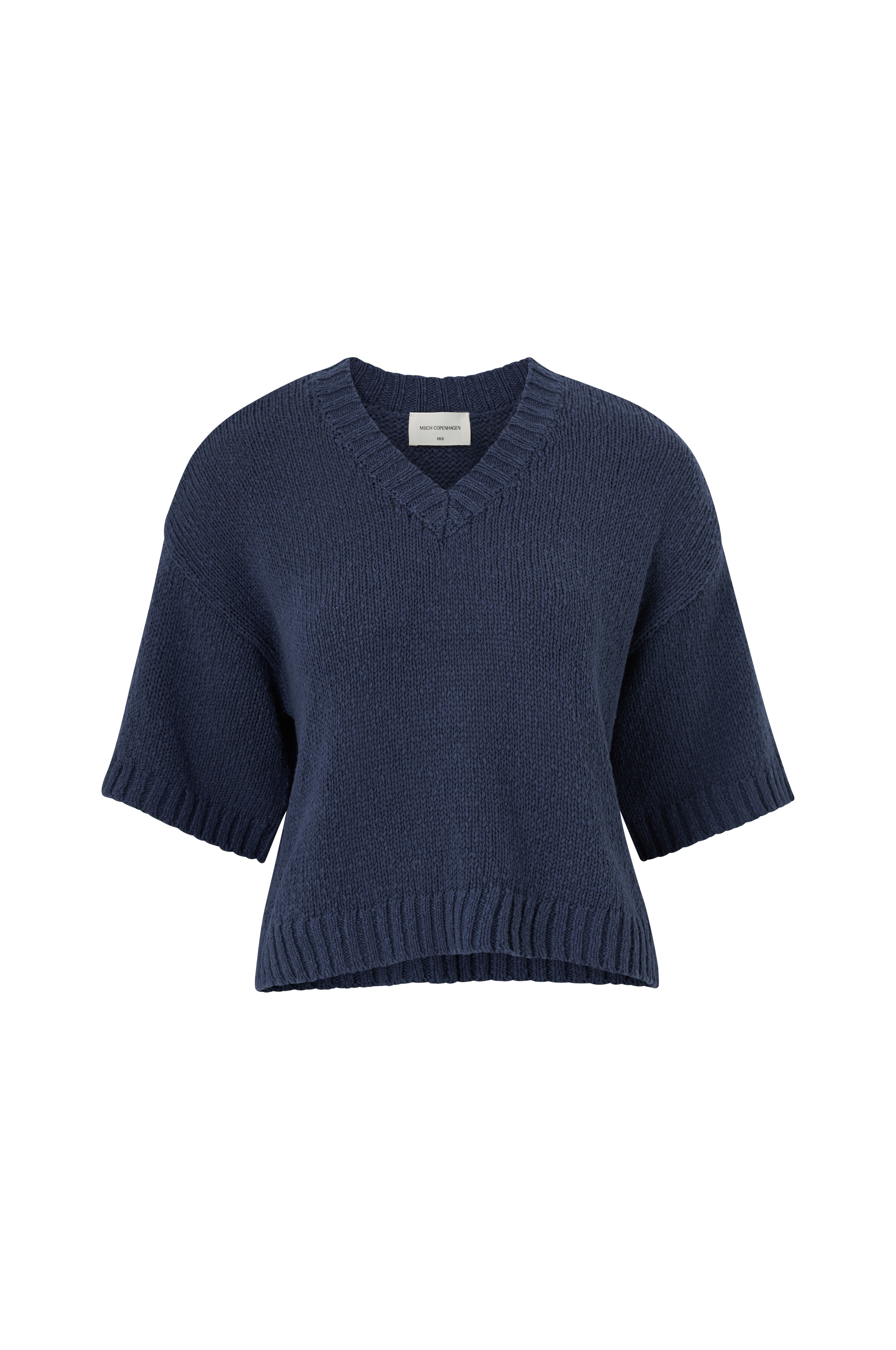 • Løststrikket Pullover med v-formet halsudskæring• Korte ærmer• Ribstrik på halsen, ved ærmeafslutningerne og ved nederste kant