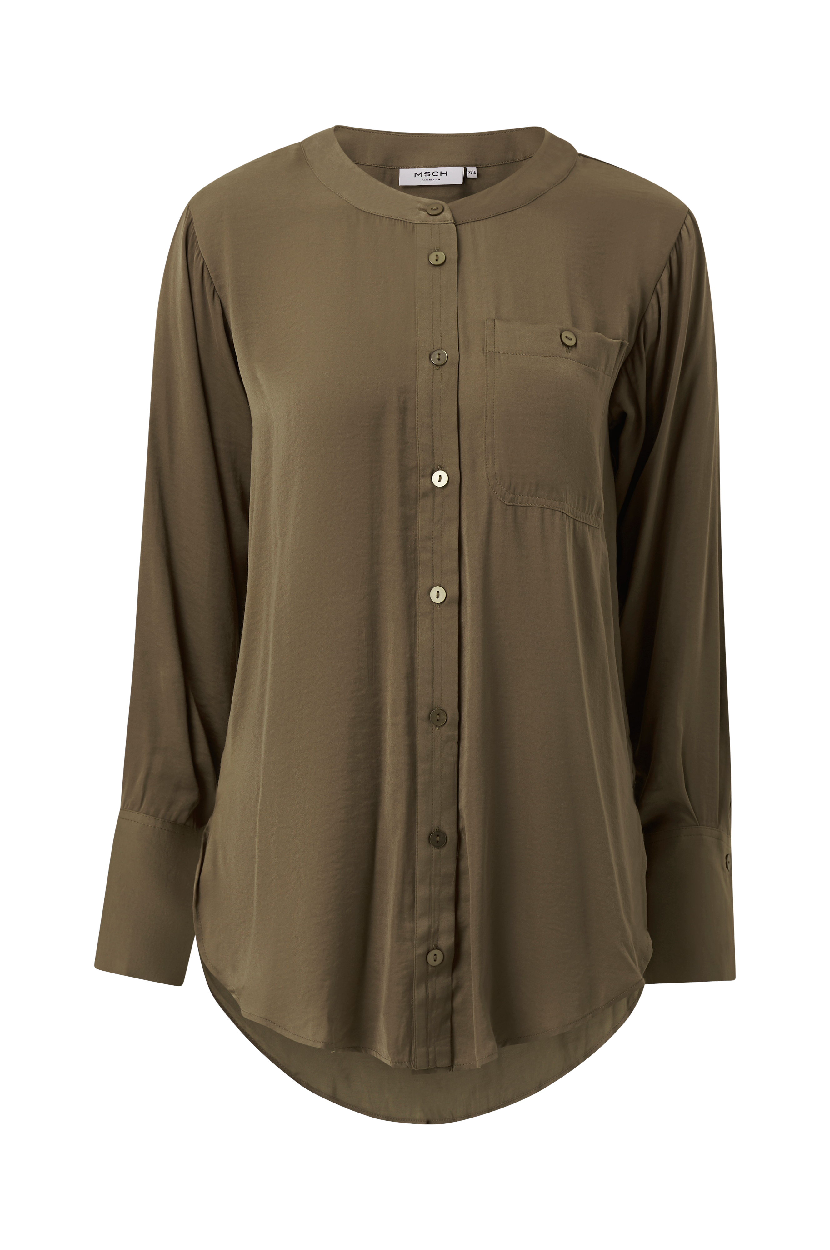 • Rund halsudskæring• Knapper• En brystlomme• Manchet med en knap• Høje slidser i siderne• Afrundet søm• Lidt længere bagtil