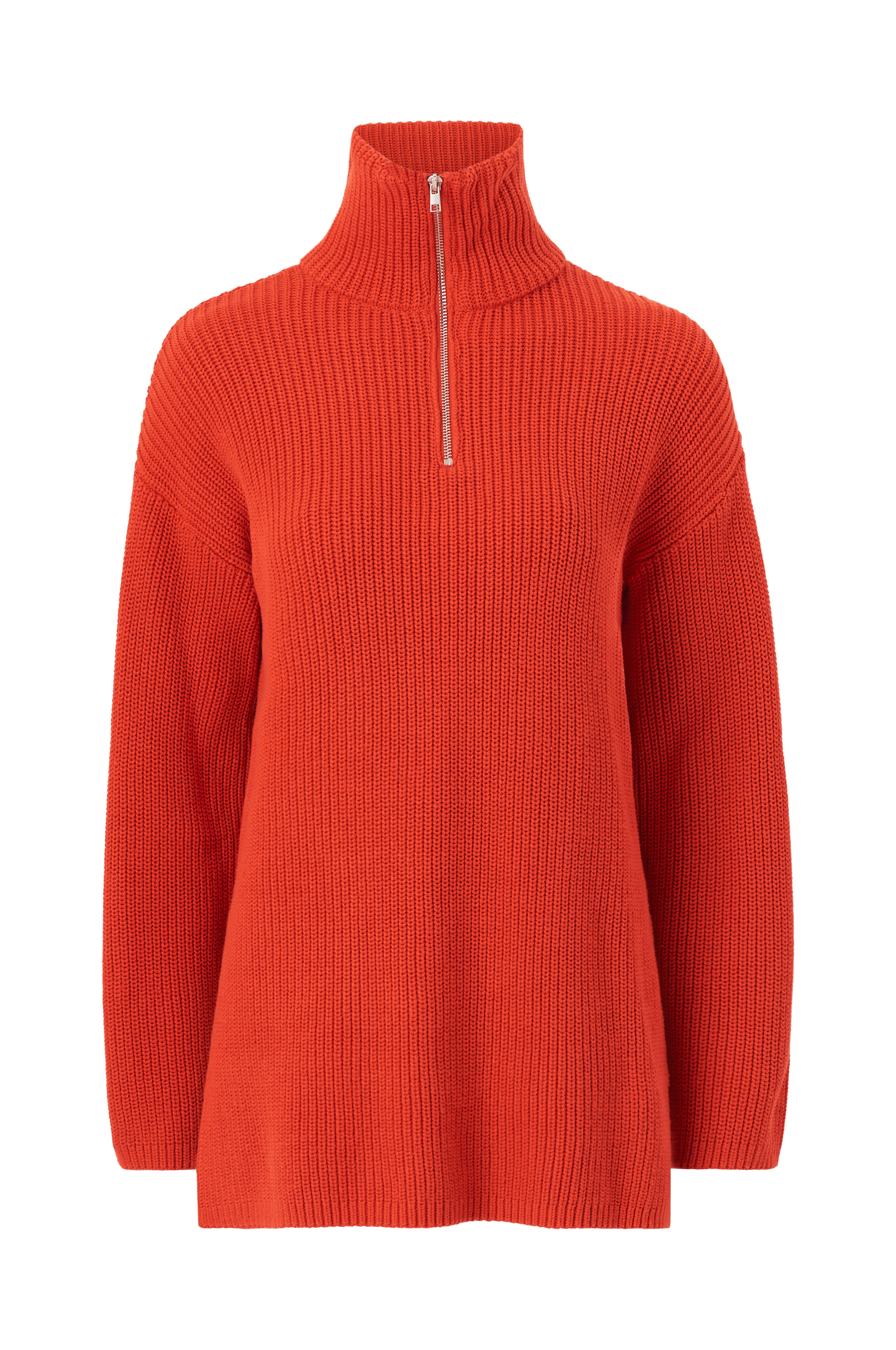 • Lige, ribstrikket model• Høj krave med lynlås• Nedsænket skulder med langt, lige ærme• Slids nede i siderne