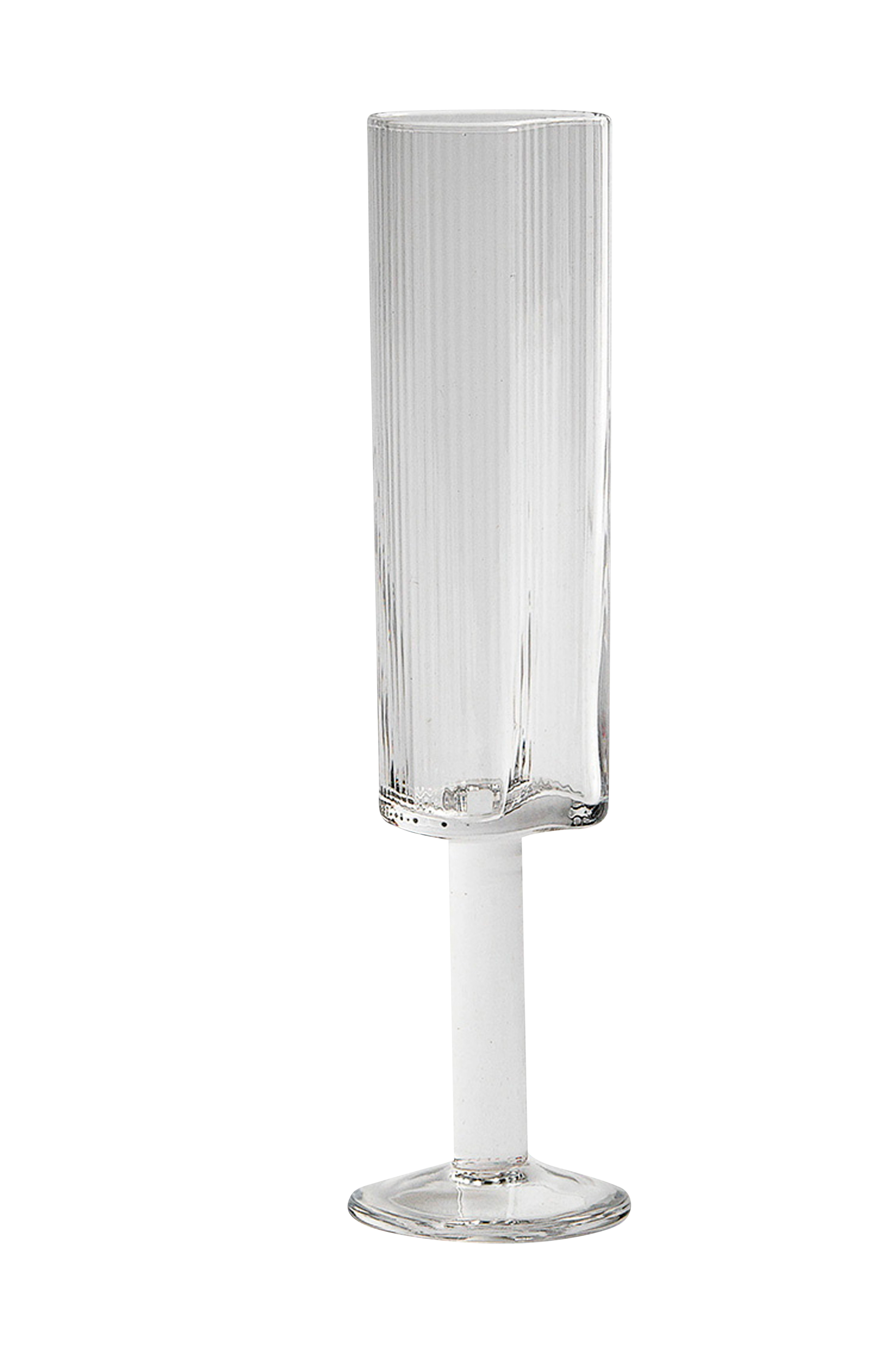 Champagneglas i klart glas fra MUUBS. Det mundblæste glas er lavet med en bølget overflade og har en smuk organisk form. Glasset tåler opvaskemaskine.