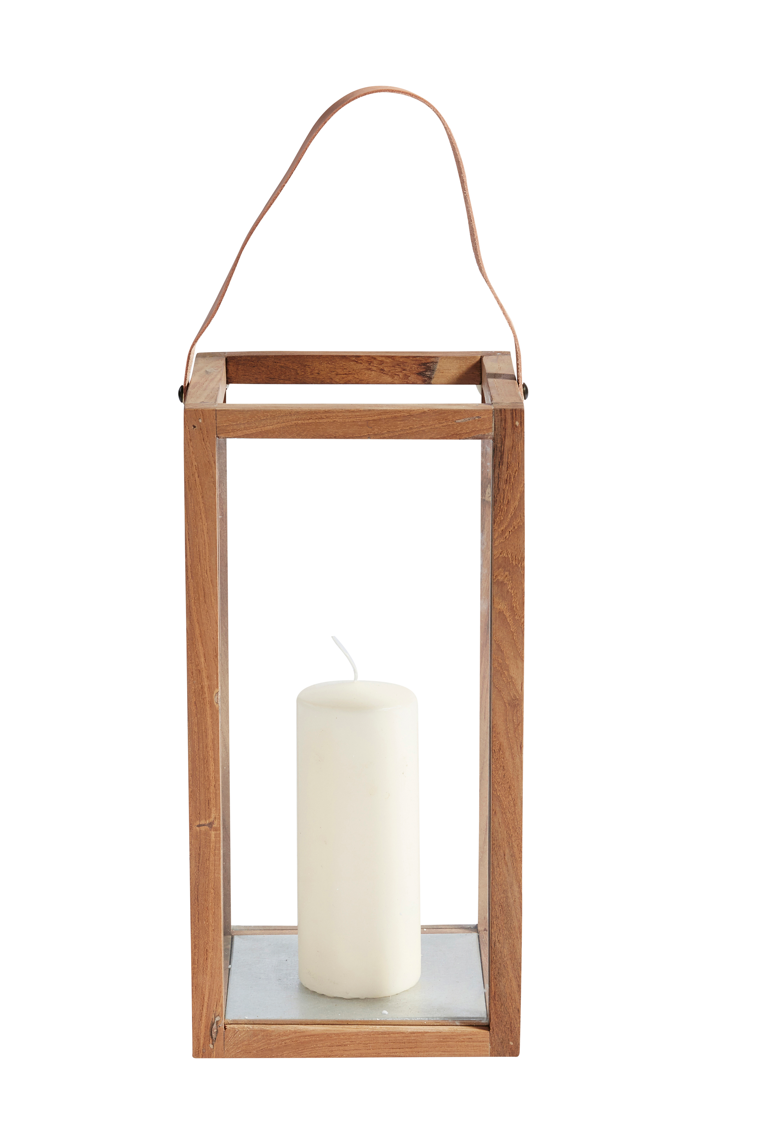 Stor lanterne i genindvundet teak med læderrem fra Muubs. Kontrasten mellem det gennemsigtige glas og den rå, rektangulære teakramme giver lanternen et spændende og tidløst udseende. Placer lanternen udendørs med stearinlys for at byde dine gæster velkommen eller brug den indendørs som en minimalistisk dekoration, der emmer af æstetisk enkelhed.