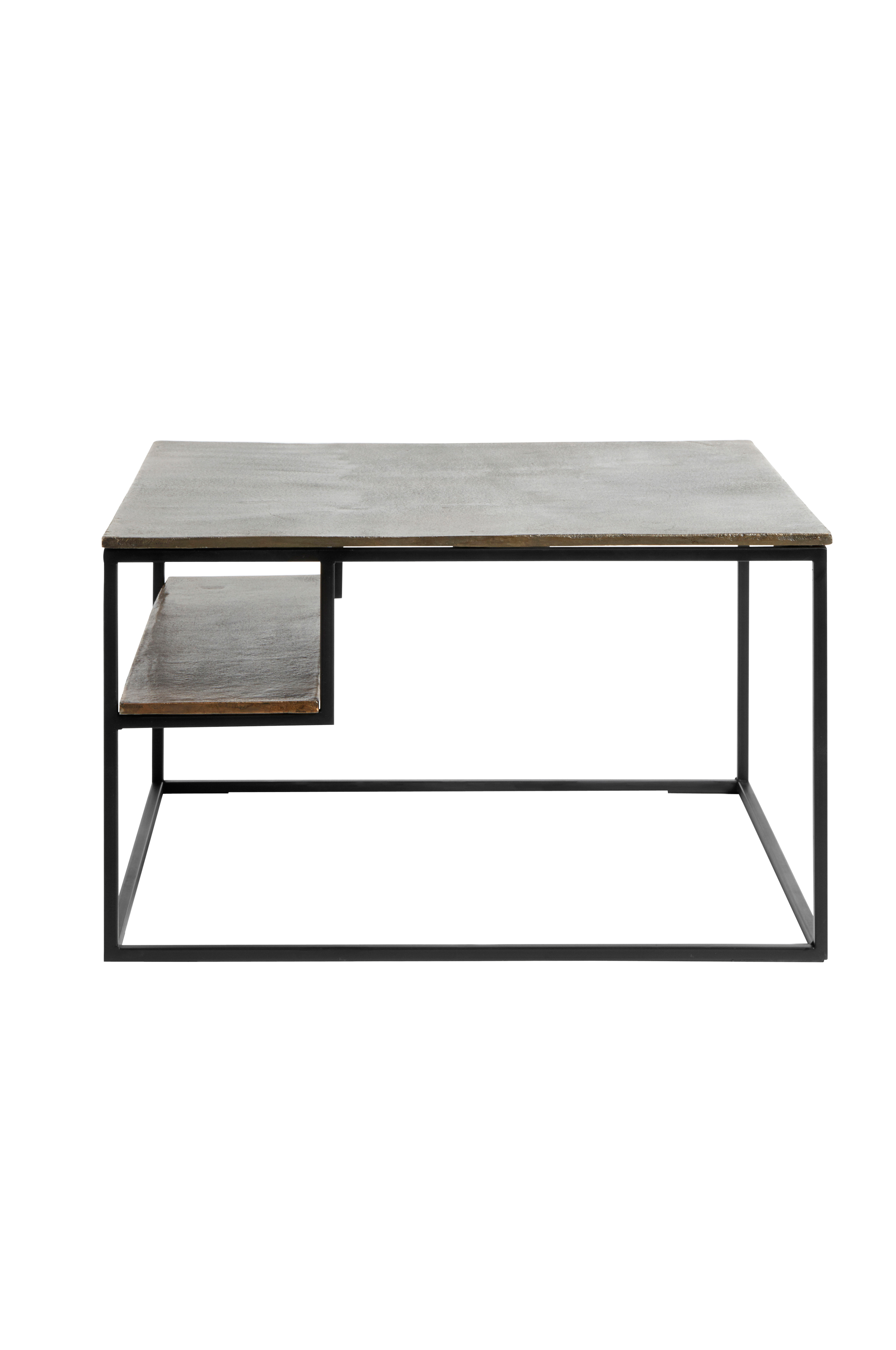 Square sofabord hitch fra muubs i jern og antik messing. Sofabordet hitch er designet med en lille dekorativ hylde nedenunder.