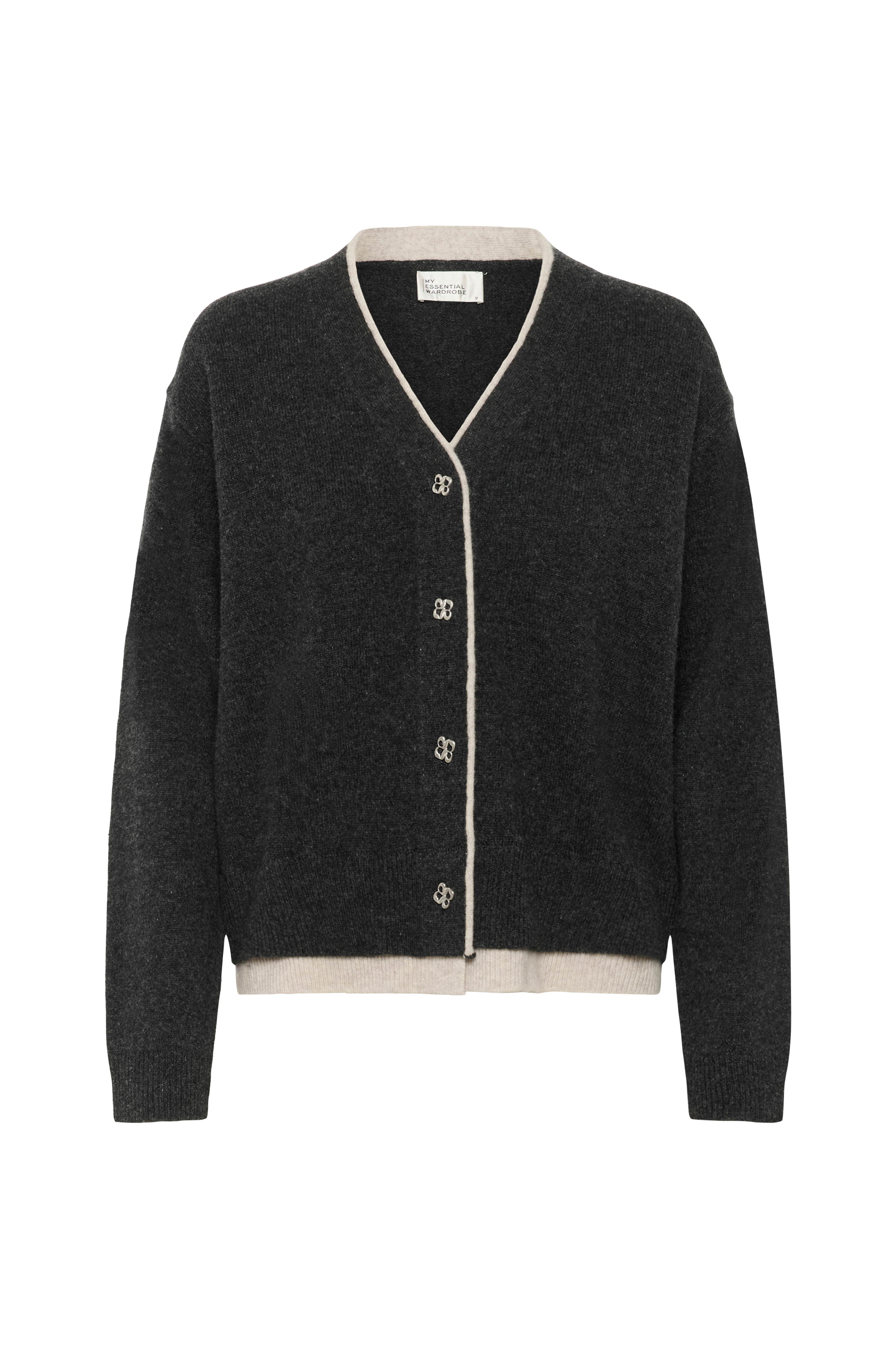 • Blød, strikket cardigan i uld• V-formet halsudskæring• Nedsænkede skuldre• Dekorative metalknapper foran• Ribstrik ved manchetterne og ved nederste kant• Kontrastfarvede kanter nederst og langs forsiden
