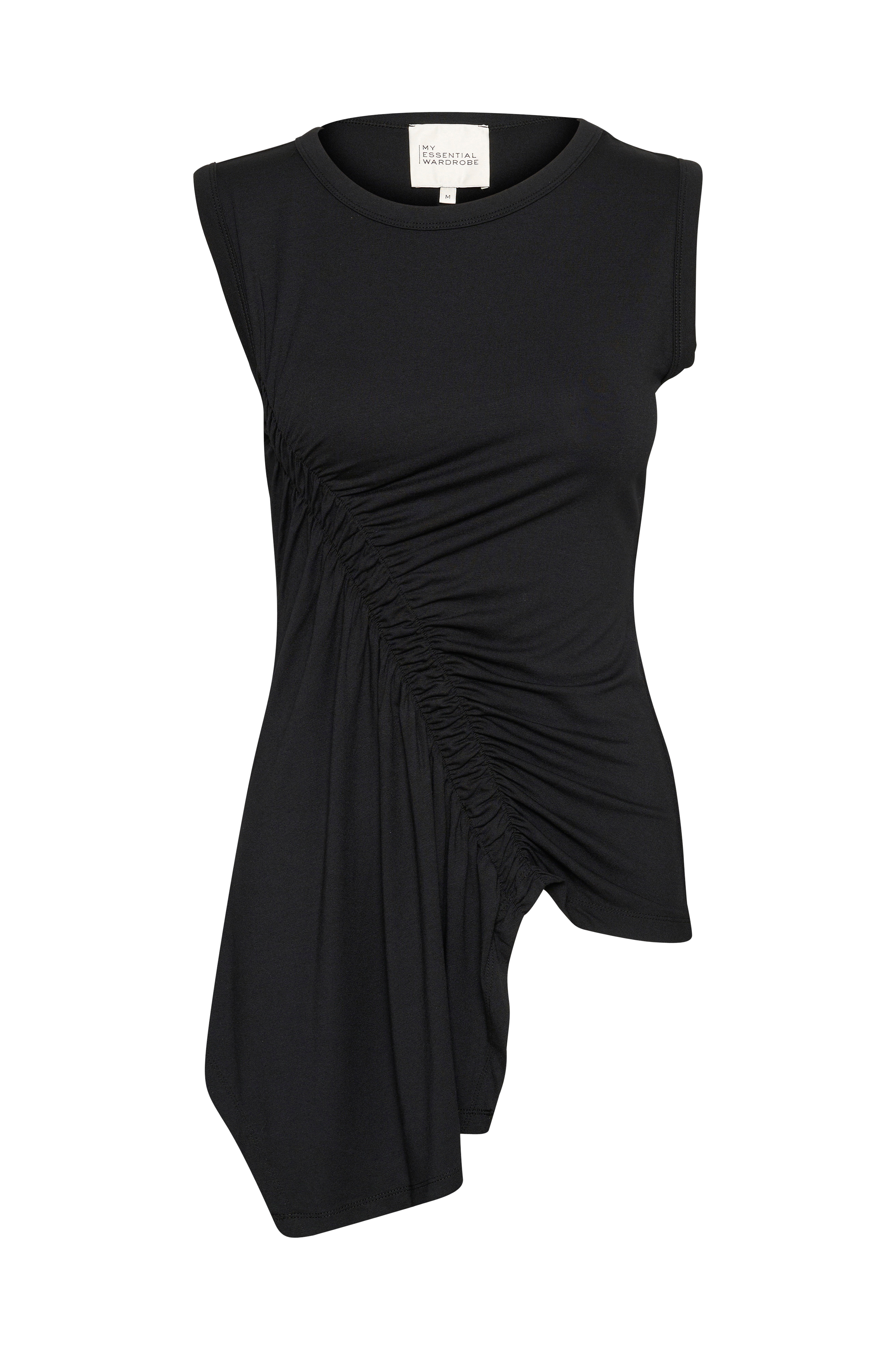 • Ærmeløs top i blødt materiale• Afrundet halsudskæring• Asymmetrisk længde på siden med bølgeformet, dekorativ detalje ved fronten