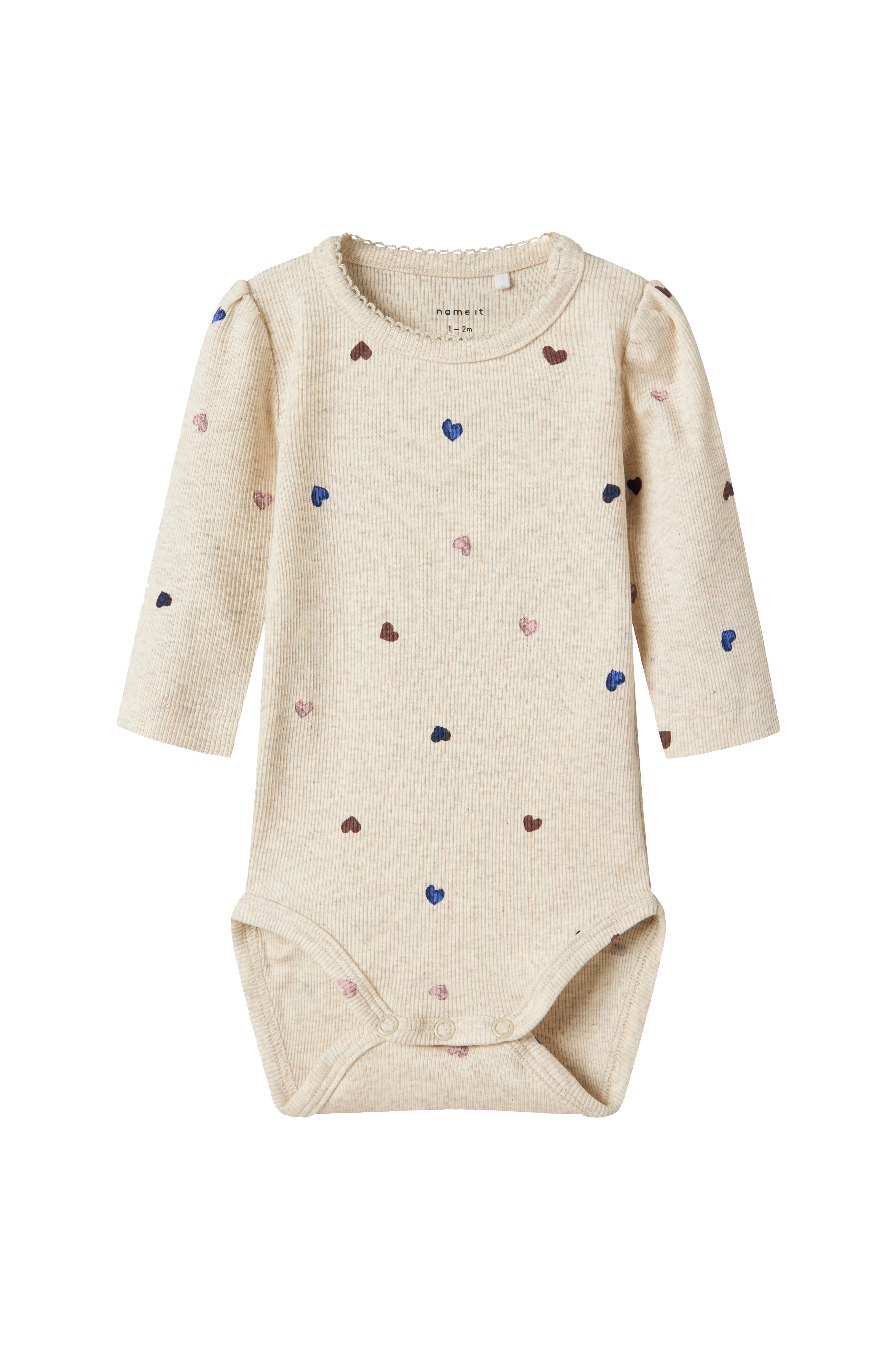 • Blød, ribbet body• Rund halsudskæring• Lange pufærmer• Trykknapper ved skridtet