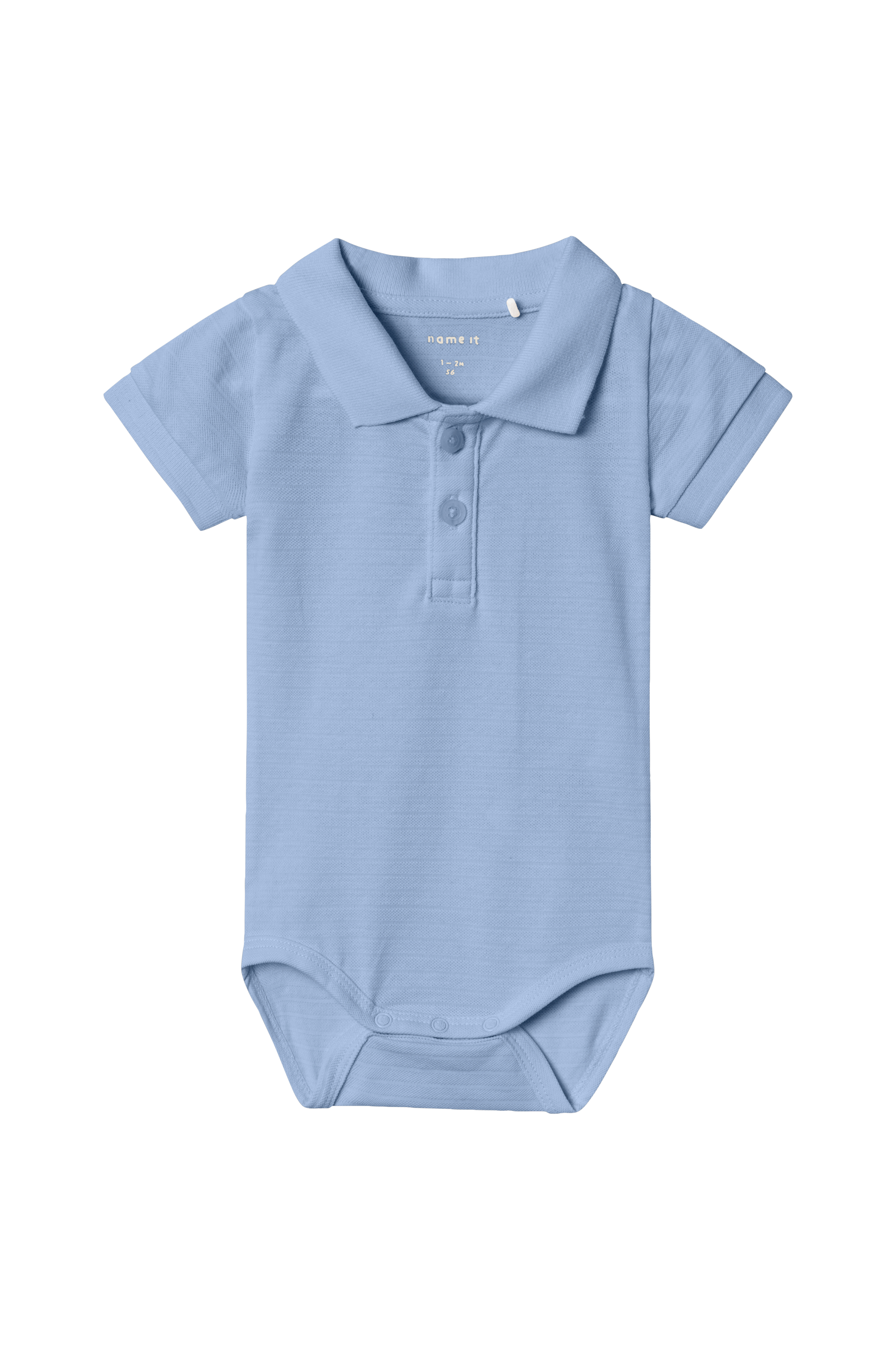 • Kortærmet bodystocking i ribbet bomuldspiké• Krave• To knapper• Trykknapper ved skridtet