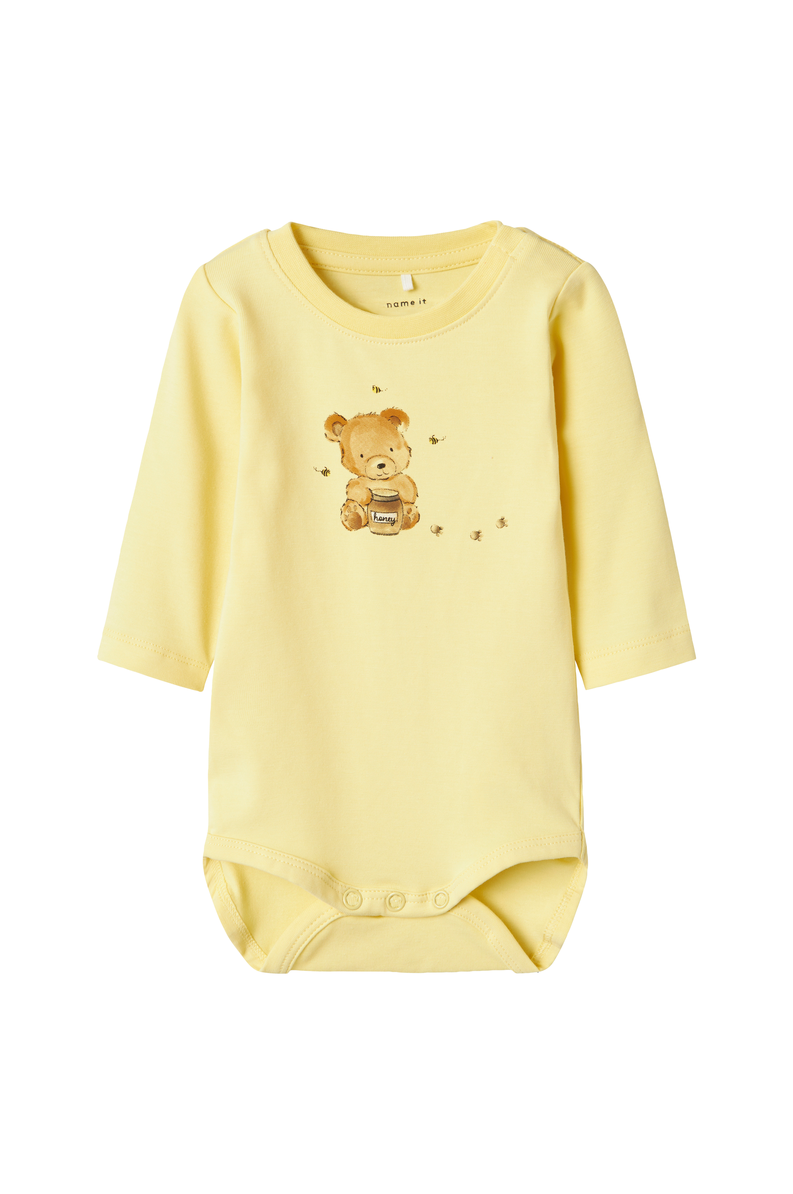 • Body i blød, elastisk bomuld med tryk foran• Rund hals• Trykknap på en skulder og ved skridtet
