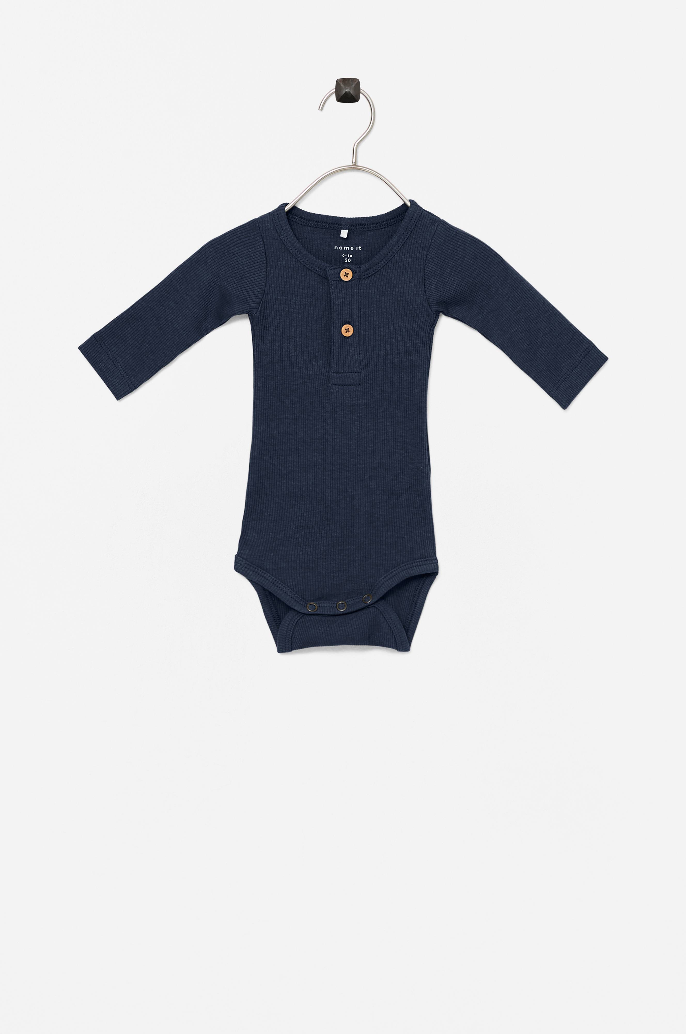• Langt ærme • Knapper oppe foran • Trykknapper ved skridtet • Ribbet jersey • Produktet indeholder økologisk bomuld, som er dyrket uden kemiske sprøjtemidler, kunstgødning og genmodificerede afgrøder (GMO). Dette betyder et sundere arbejdsmiljø for landmænd og bedre jord.