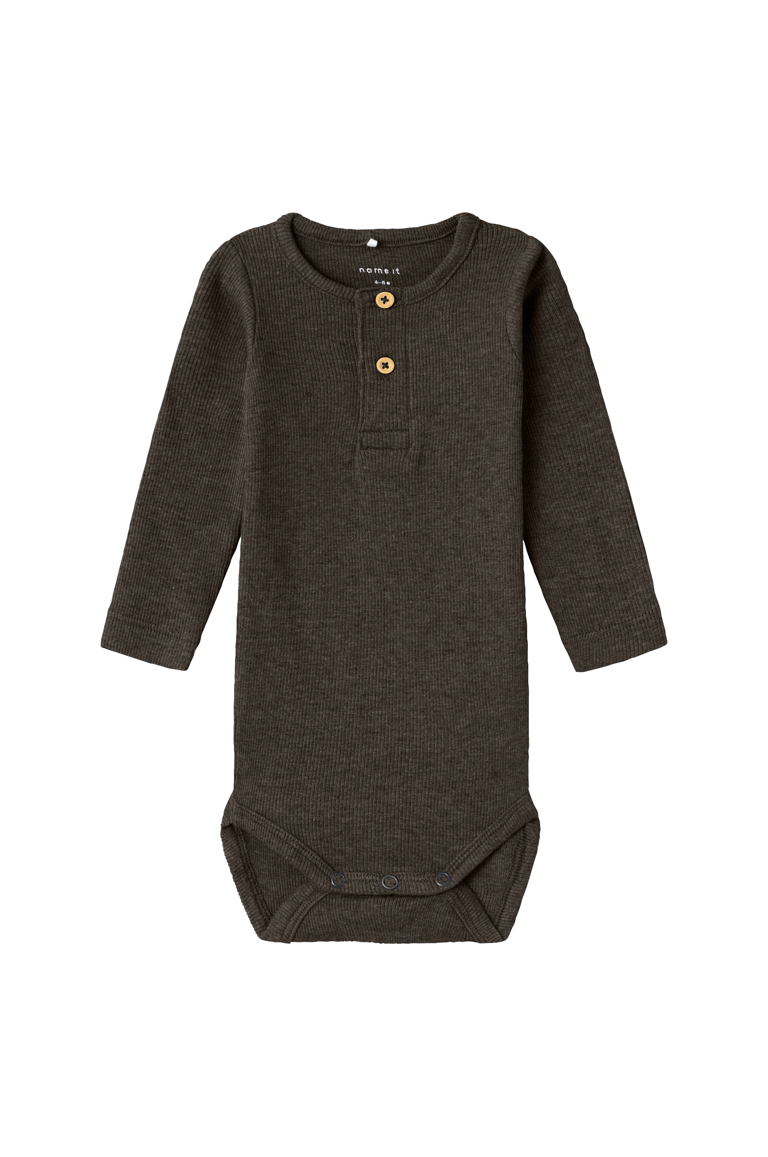 • Langt ærme • Knapper oppe foran • Trykknapper ved skridtet • Ribbet jersey • Produktet indeholder økologisk bomuld, som er dyrket uden kemiske sprøjtemidler, kunstgødning og genmodificerede afgrøder (GMO). Dette betyder et sundere arbejdsmiljø for landmænd og bedre jord.