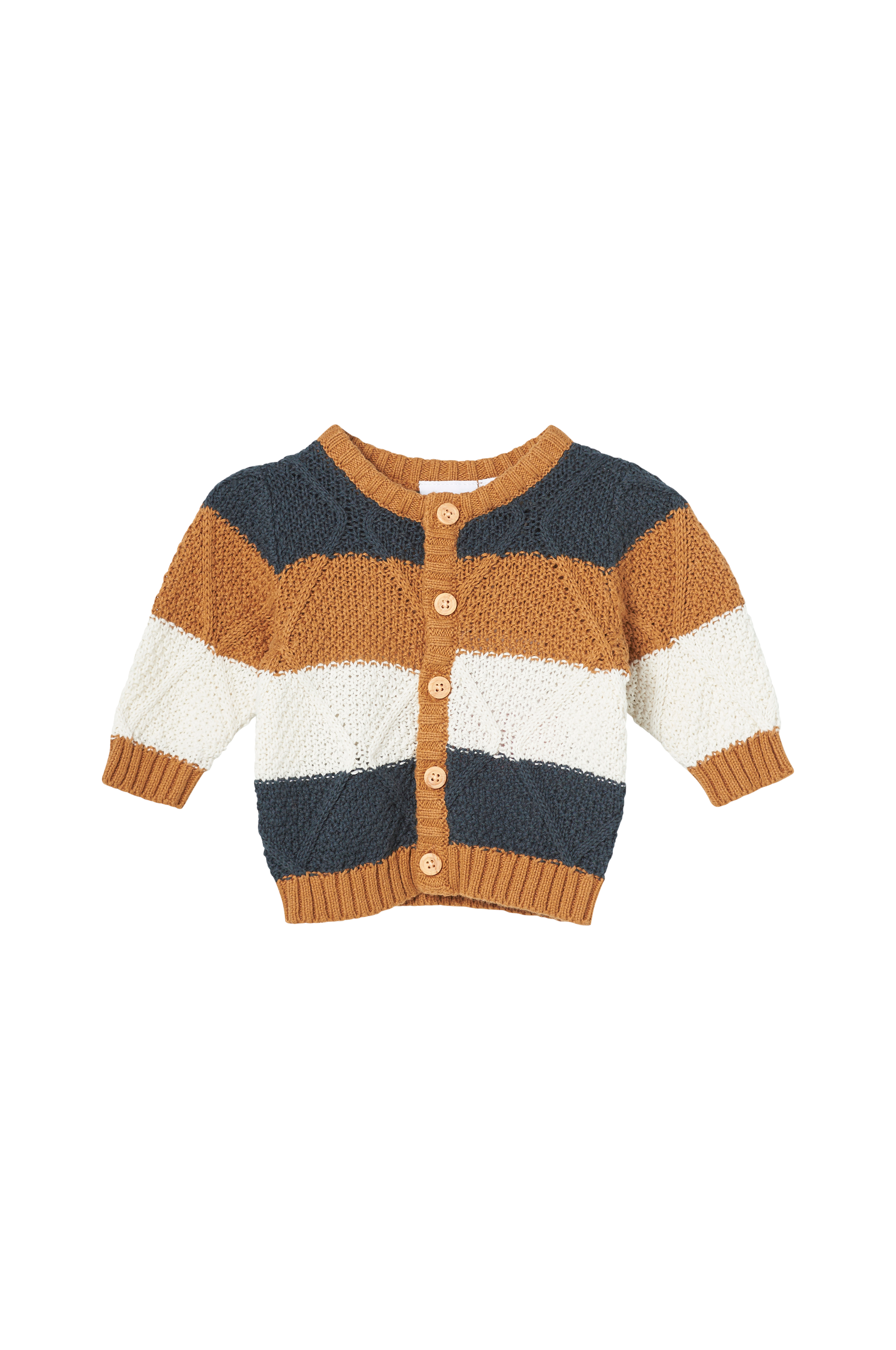• Strukturstrikket model• Rund hals• Knapper foran• Ribstrikkede kanter