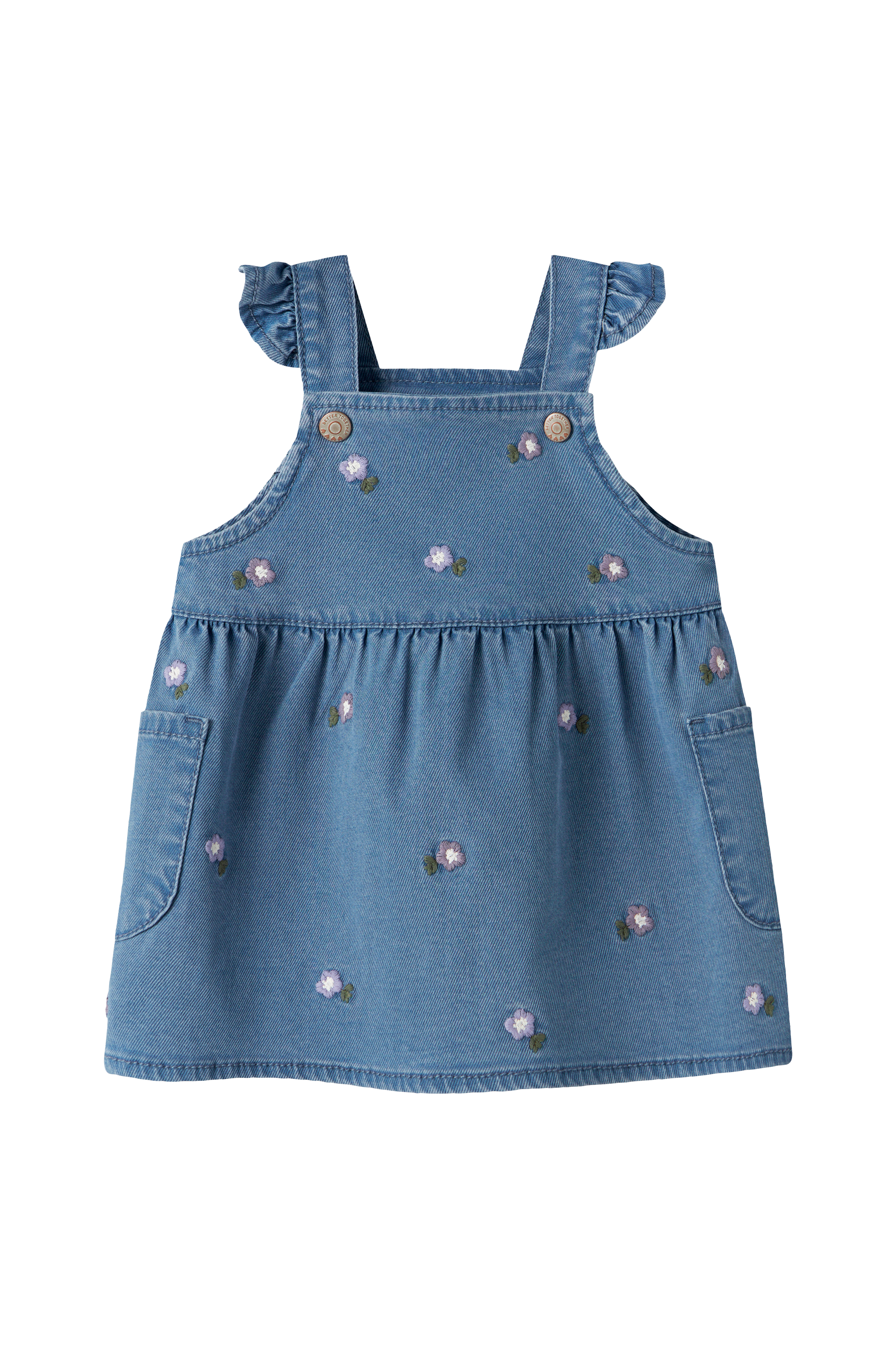 • Overallkjole i denim med broderede blomster hele vejen rundt• Volanter på skulderstropperne• Rynket udskæring• Sidelommer