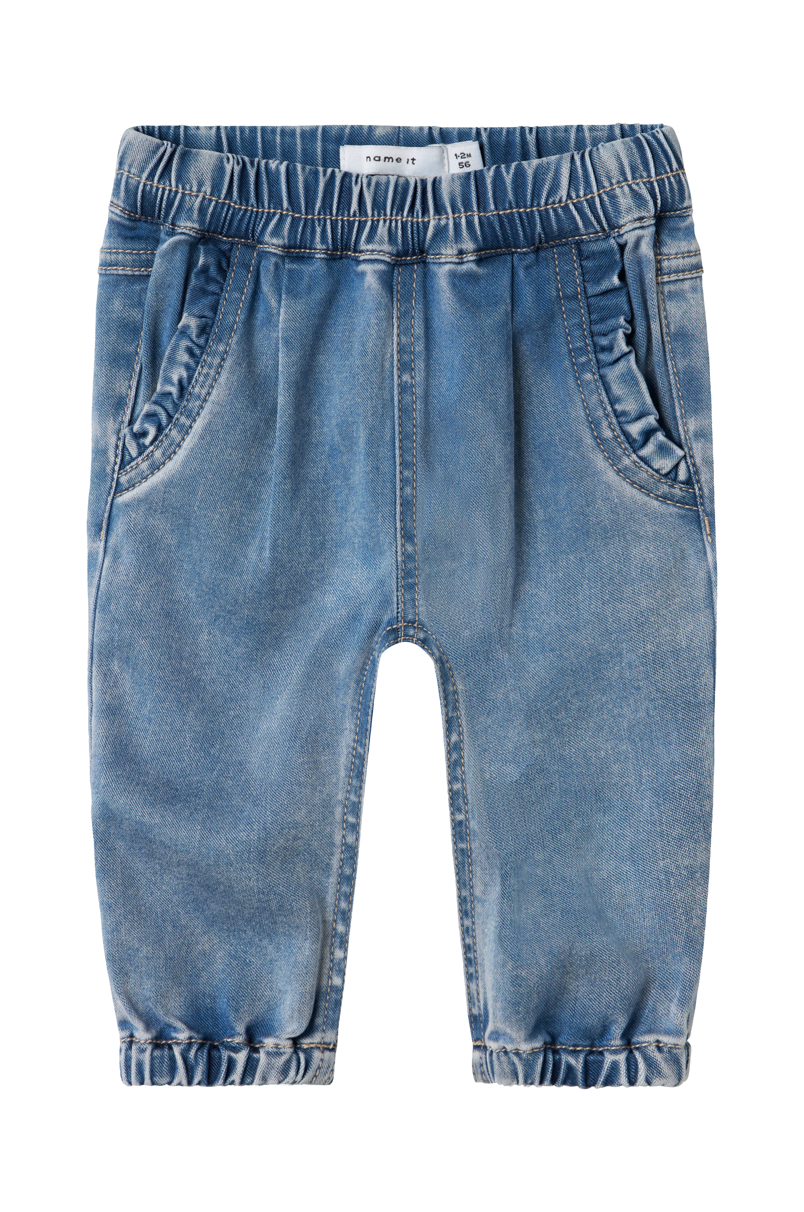 • Bløde jeans med justérbar talje• Snydelommer med volanter foran• Elastik ved enden af benene