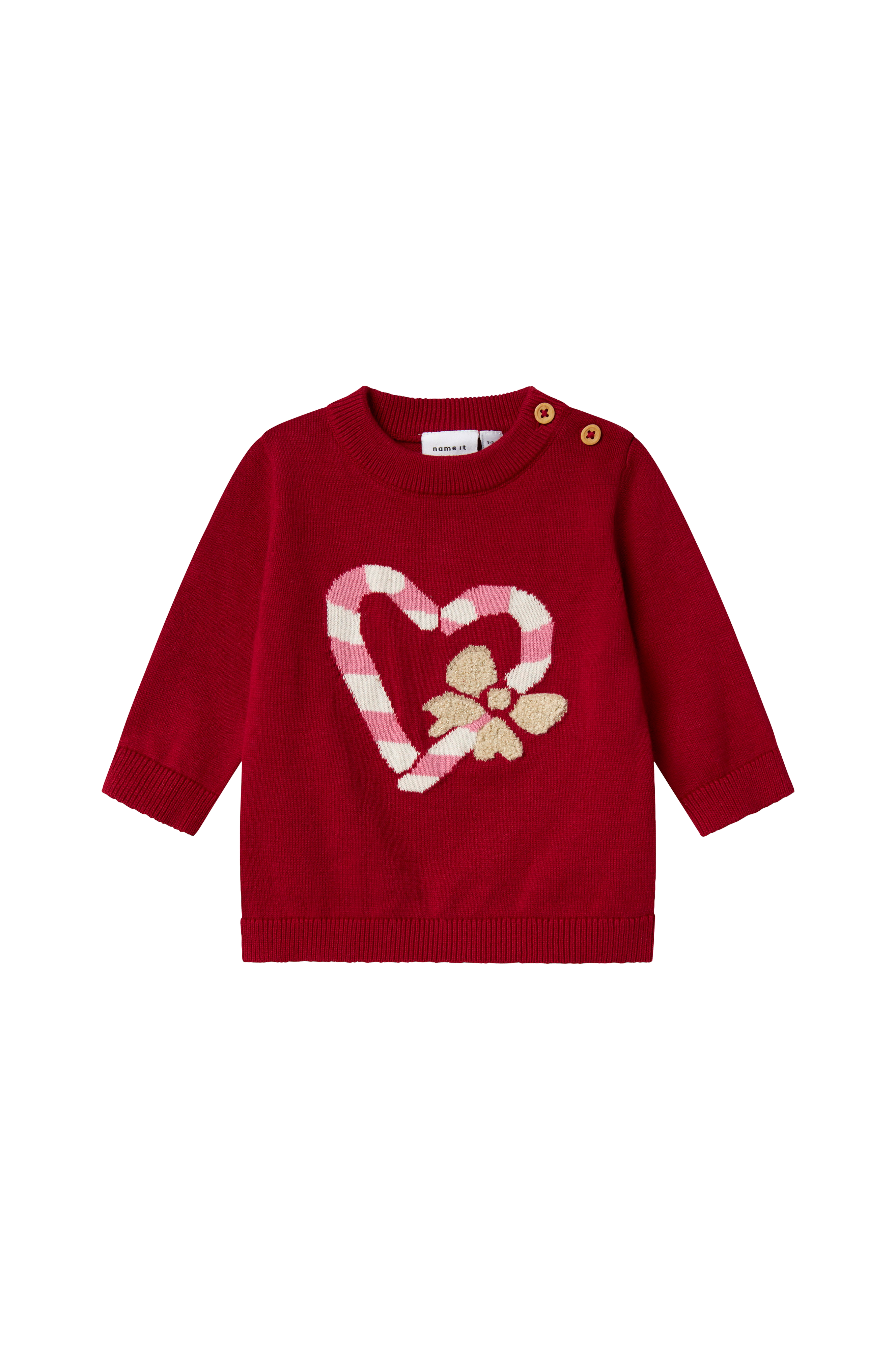 • Fintstrikket, langærmet Pullover• Rund, ribstrikket halsudskæring• Knapper på en skulder• Strikket hjerte med sløjfe i teddy foran• Ribstrik ved manchetterne og ved nederste kant