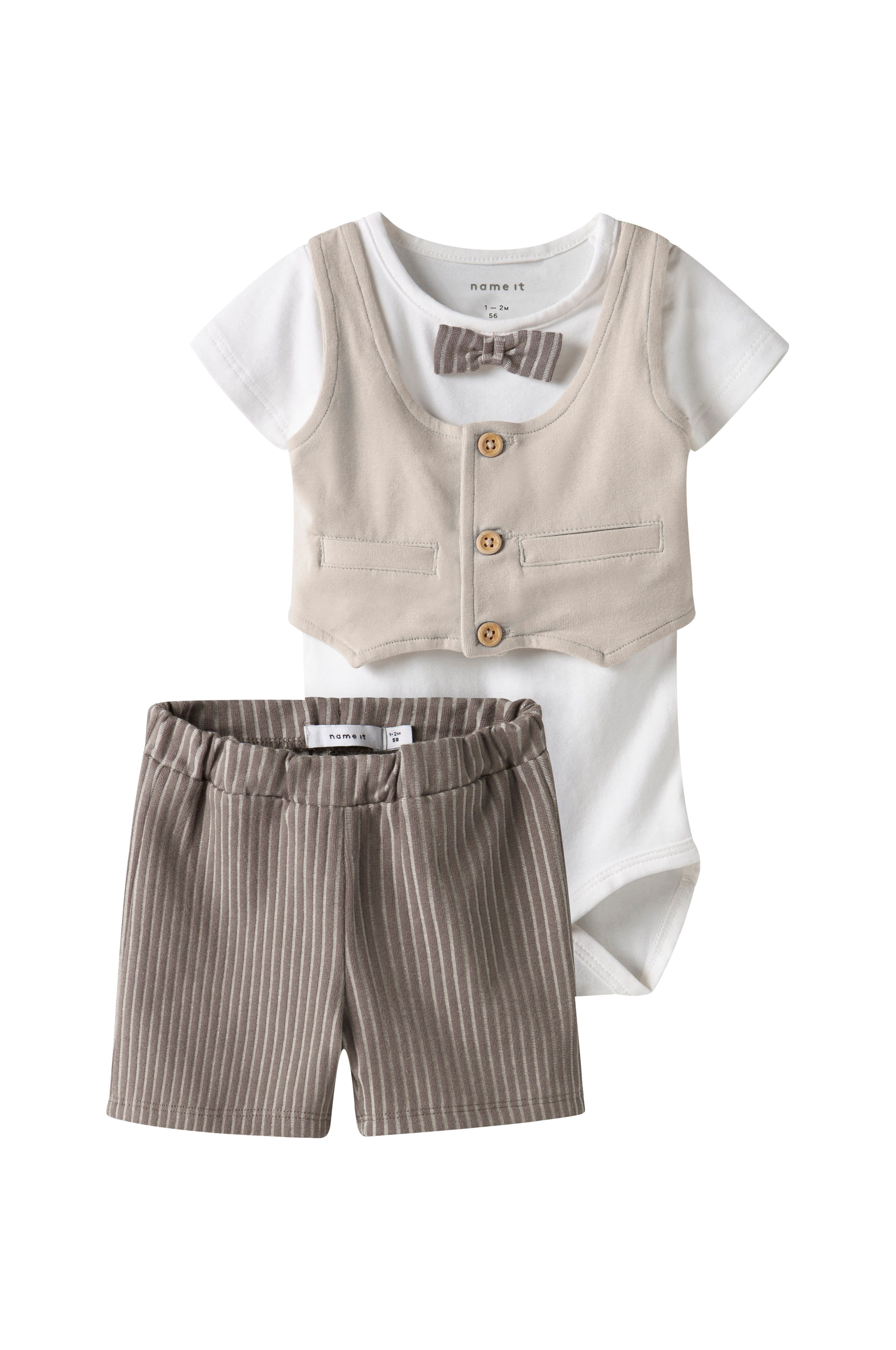 • 2-delt sæt med body og shorts• Body med påsyet vest og butterfly• Trykknapper på en skulder og ved skridtet• Shorts med justérbar, elastisk talje