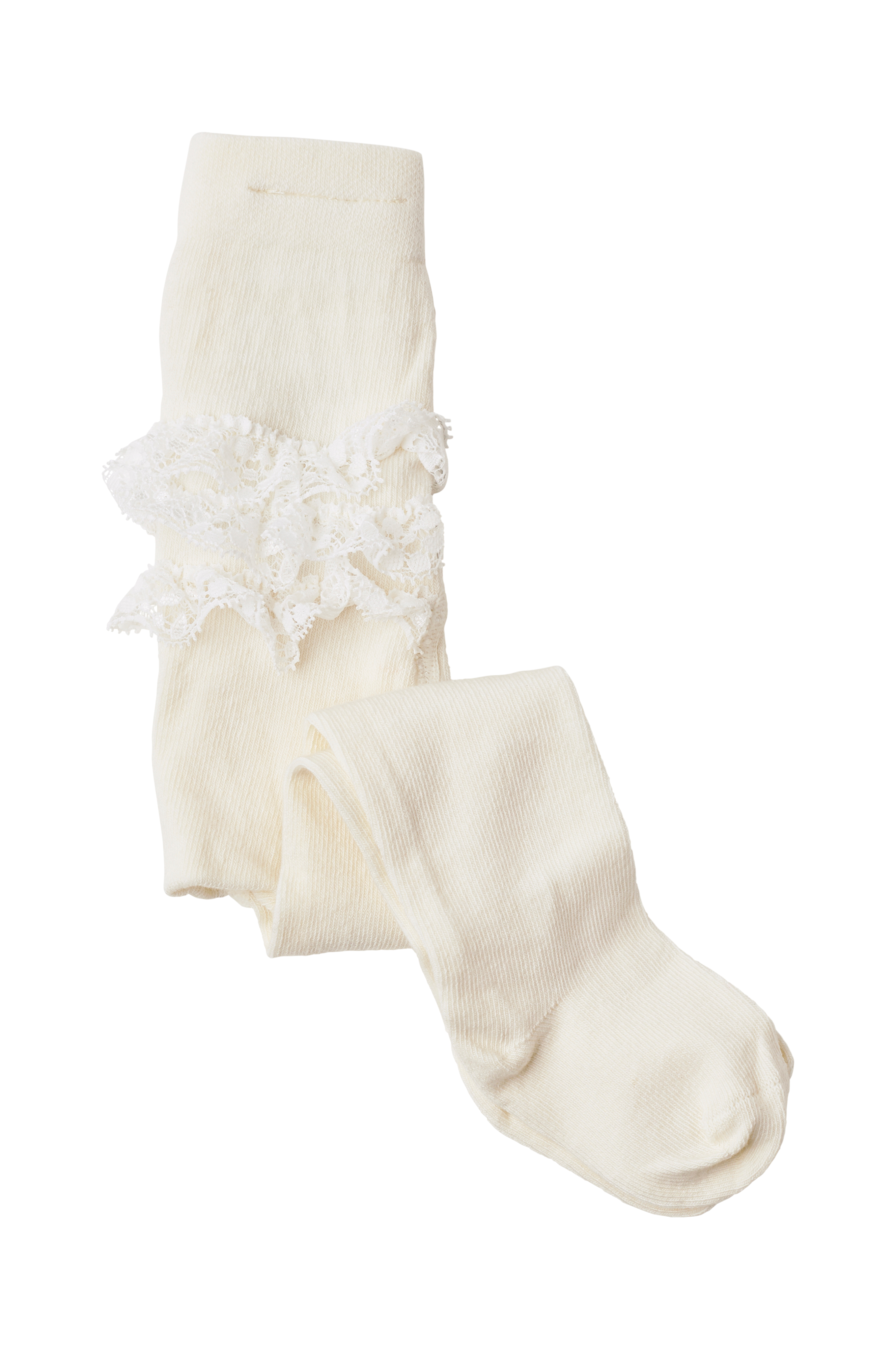 • Fintstrikkede strømpebukser• Hel fod• Elastisk talje• Blondevolanter bagved