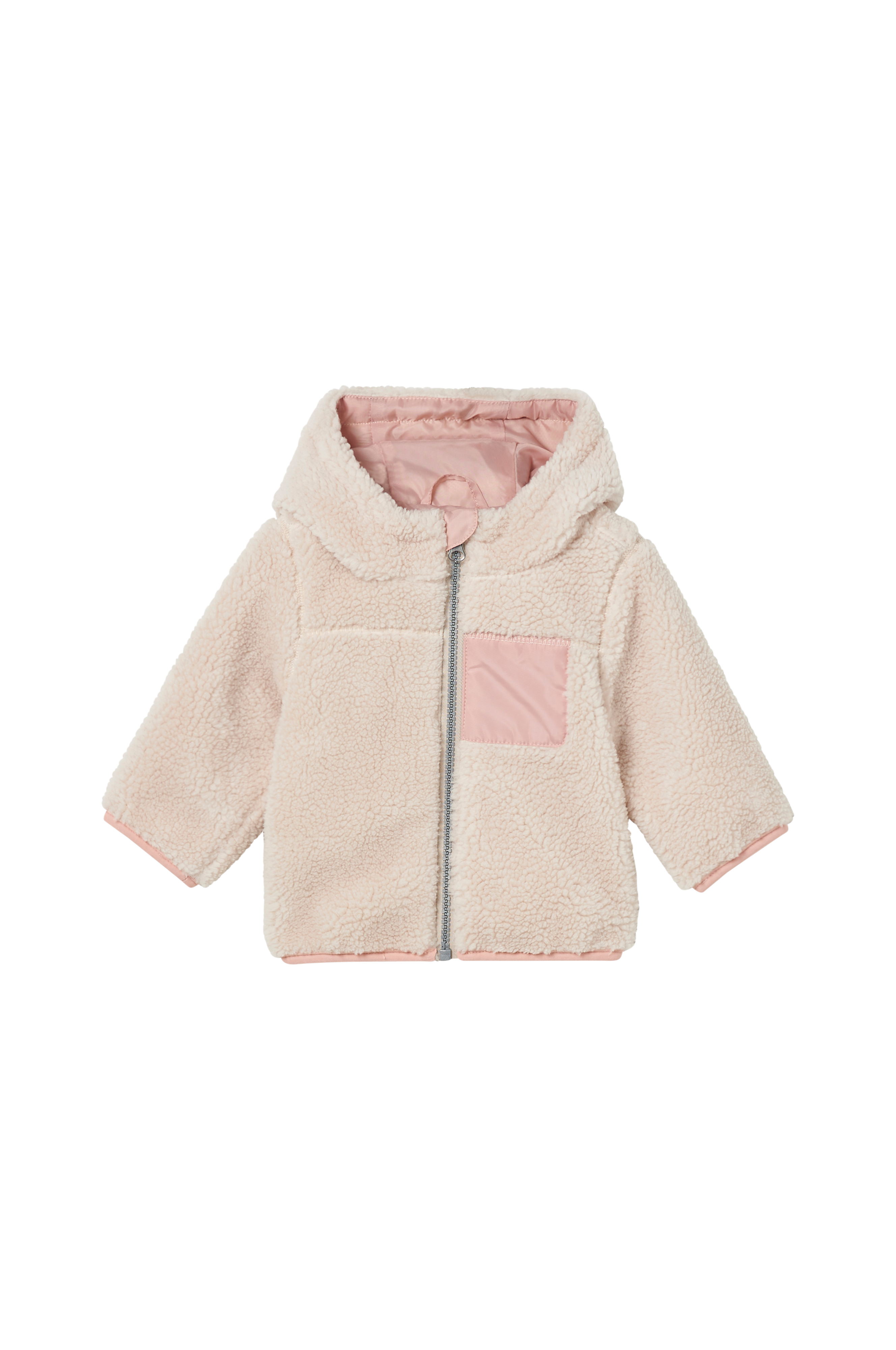 • Jakke i teddy• Glat, vævet for• Fast hætte• Lynlås• Elastiske kanter ved manchetterne og nederst