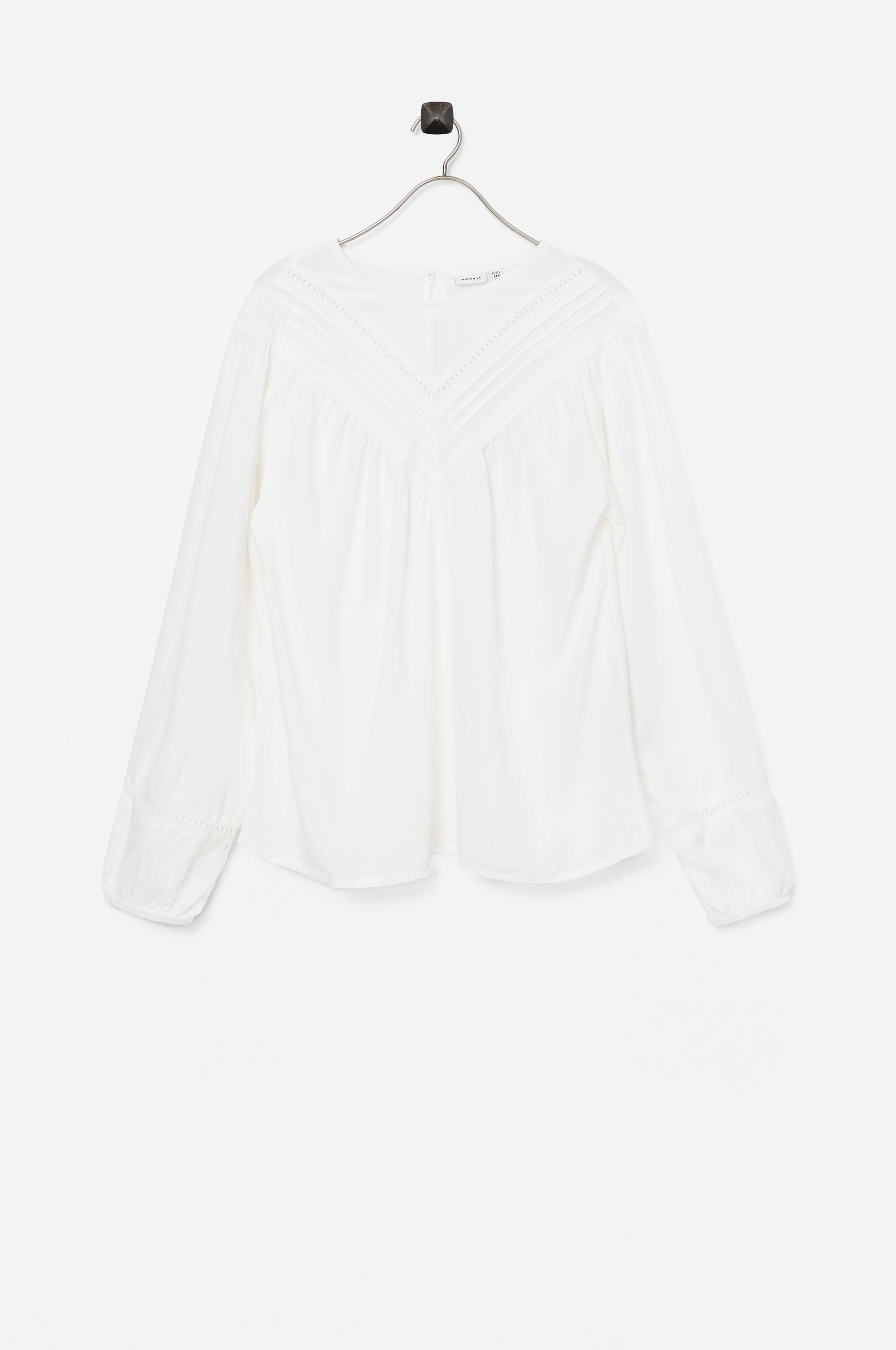 • Bluse i viskose• Rund halsudskæring• Slids med knap i nakken• Biselæg oppe foran• Blondedetaljer oppe foran og ved ærmeafslutningerne• Elastik ved manchetterne• Rynkede detaljer foran og bagpå