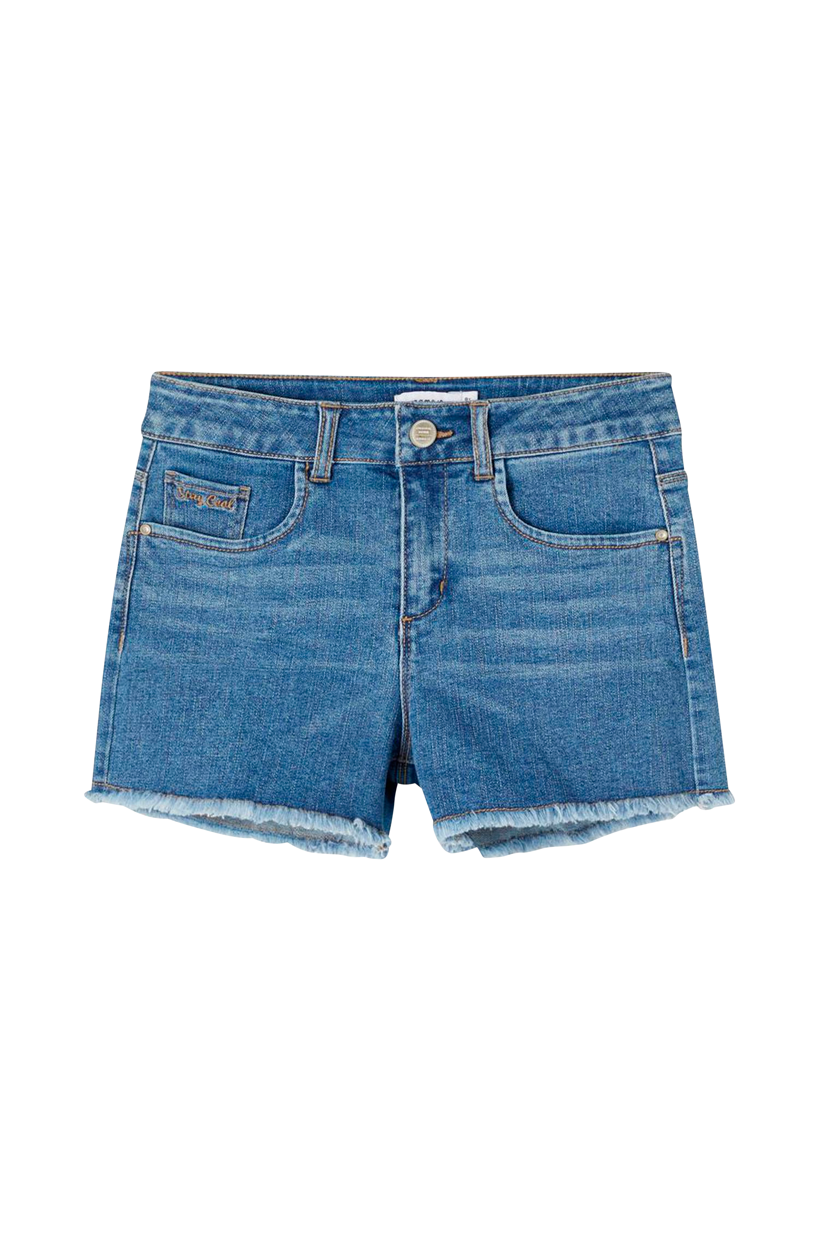 Denimshorts i stretchkvalitet med frynsede benkanter. 5-lommemodel med lynlåsgylp. Broderet tekst ved den ene forlomme. Justerbar talje med indvendig knapelastik.