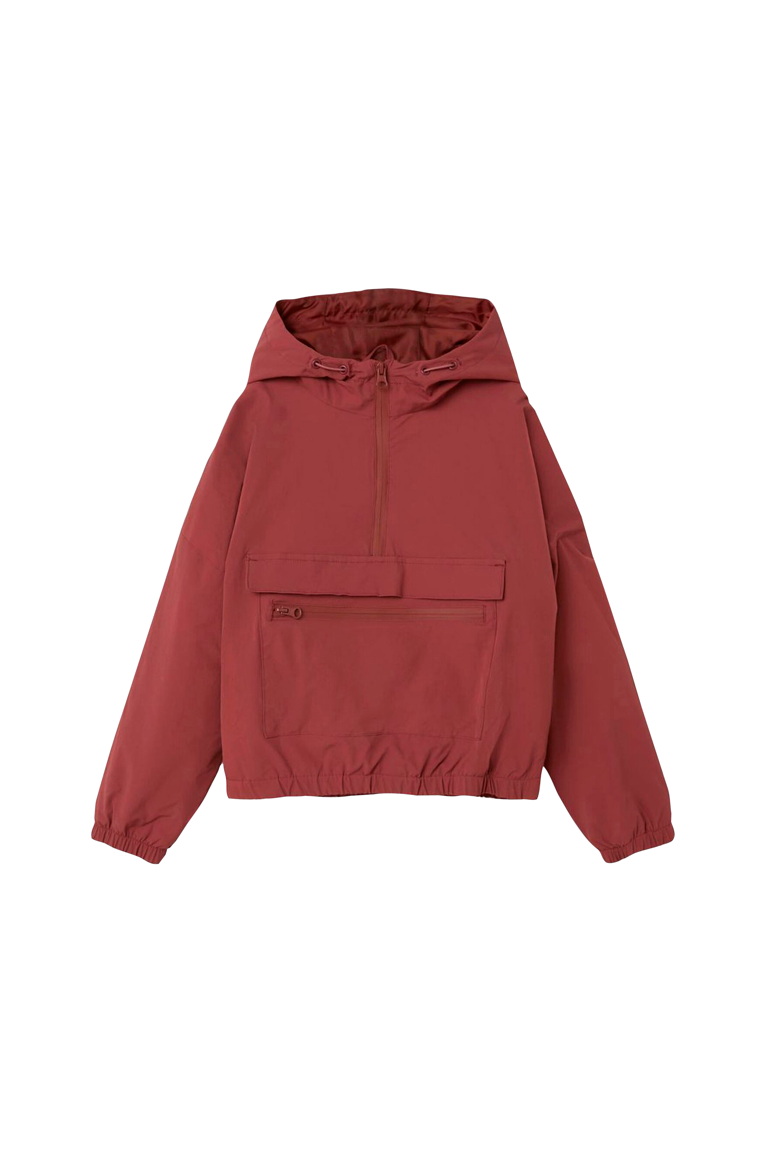 Jakke i anorakmodel som trækkes over hovedet. Fremstillet i nylon med let stretch. Fast hætte med løbegang. Halvlang lynlås. Kængurulomme med lynlås. Elastik i ærmekanten og kanten forneden.
