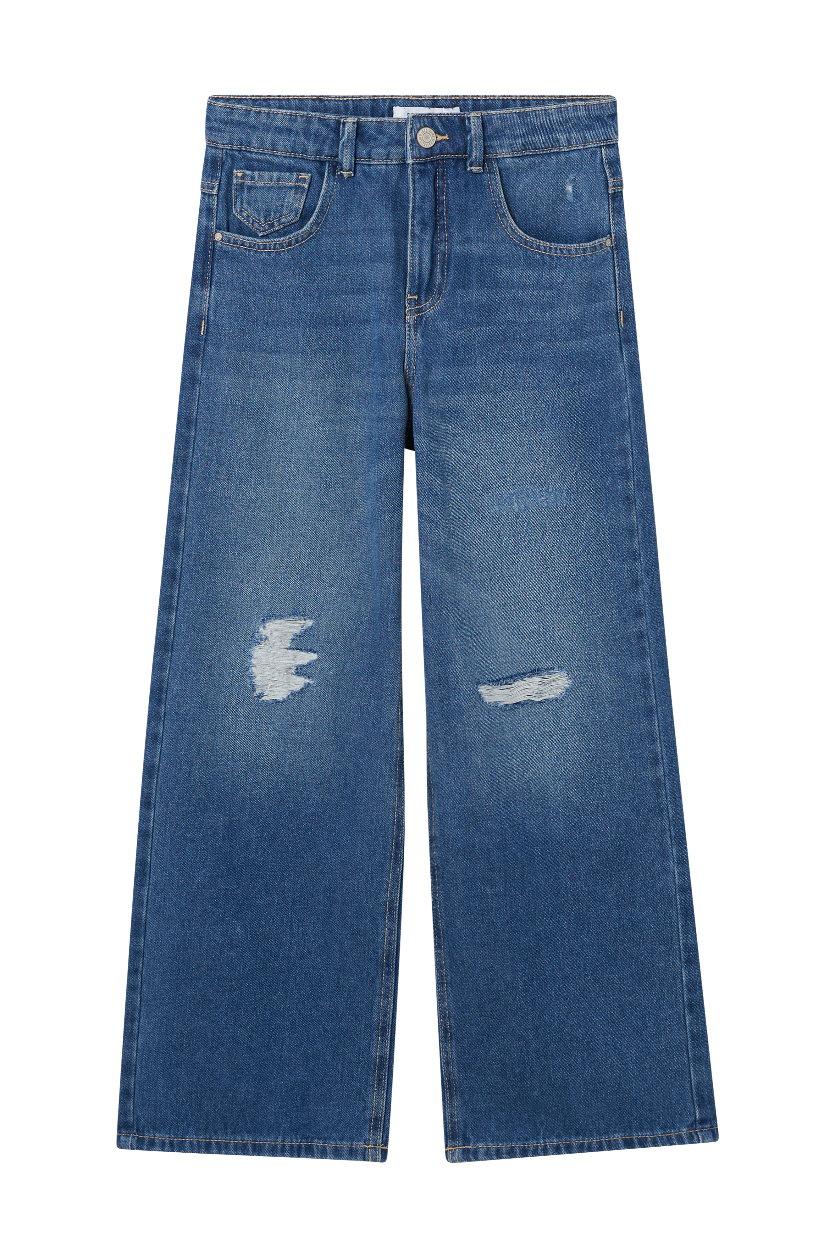 Jeans med løs pasform og vide ben. 5-lommemodel med slidte effekter. Justerbar talje. Gylp med lynlås.