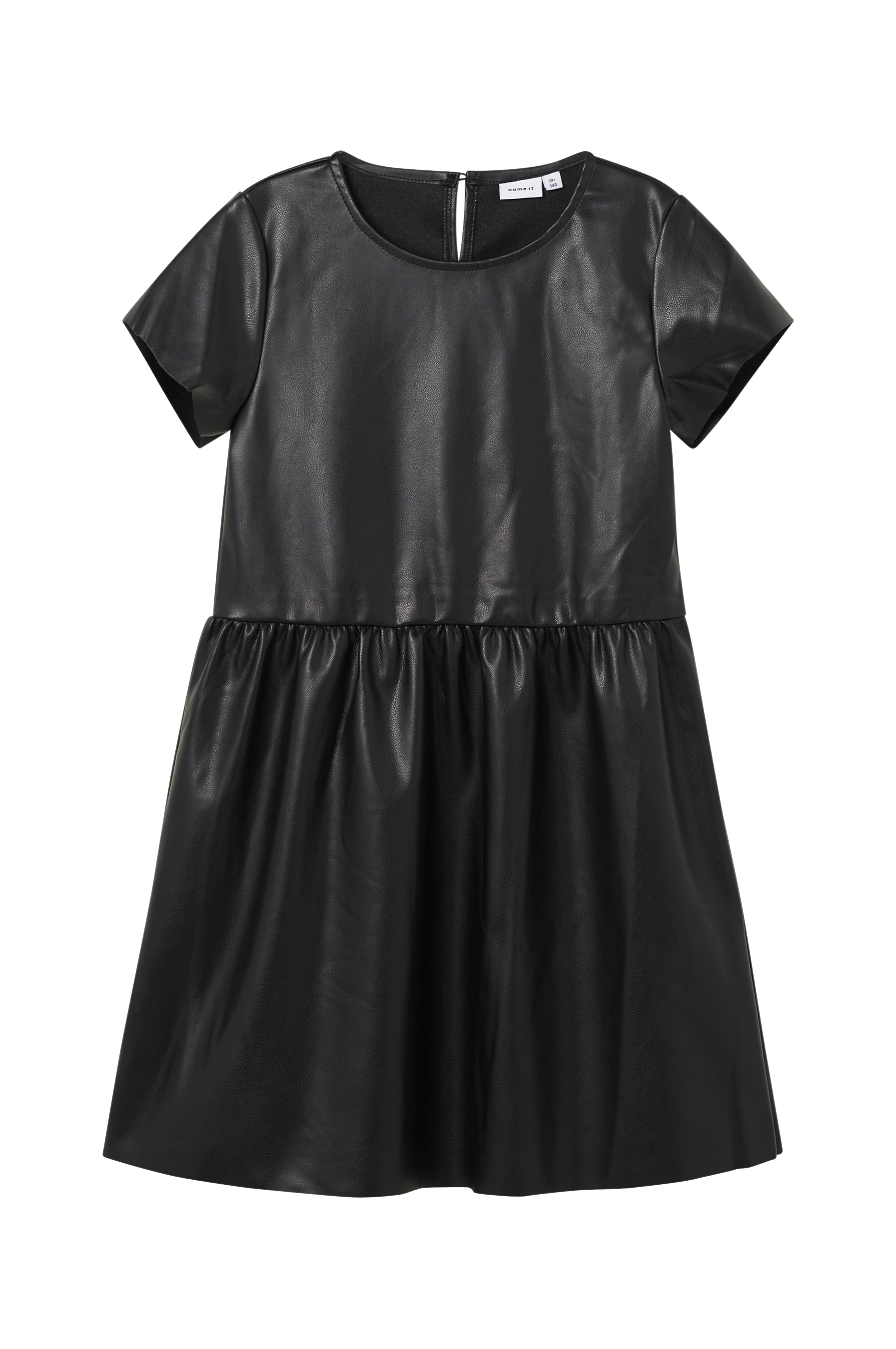 • Kjole i elastisk imiteret læder• Rund hals med ventilation og knap i nakken• Korte ærmer• Rynket talje• Blød inderside