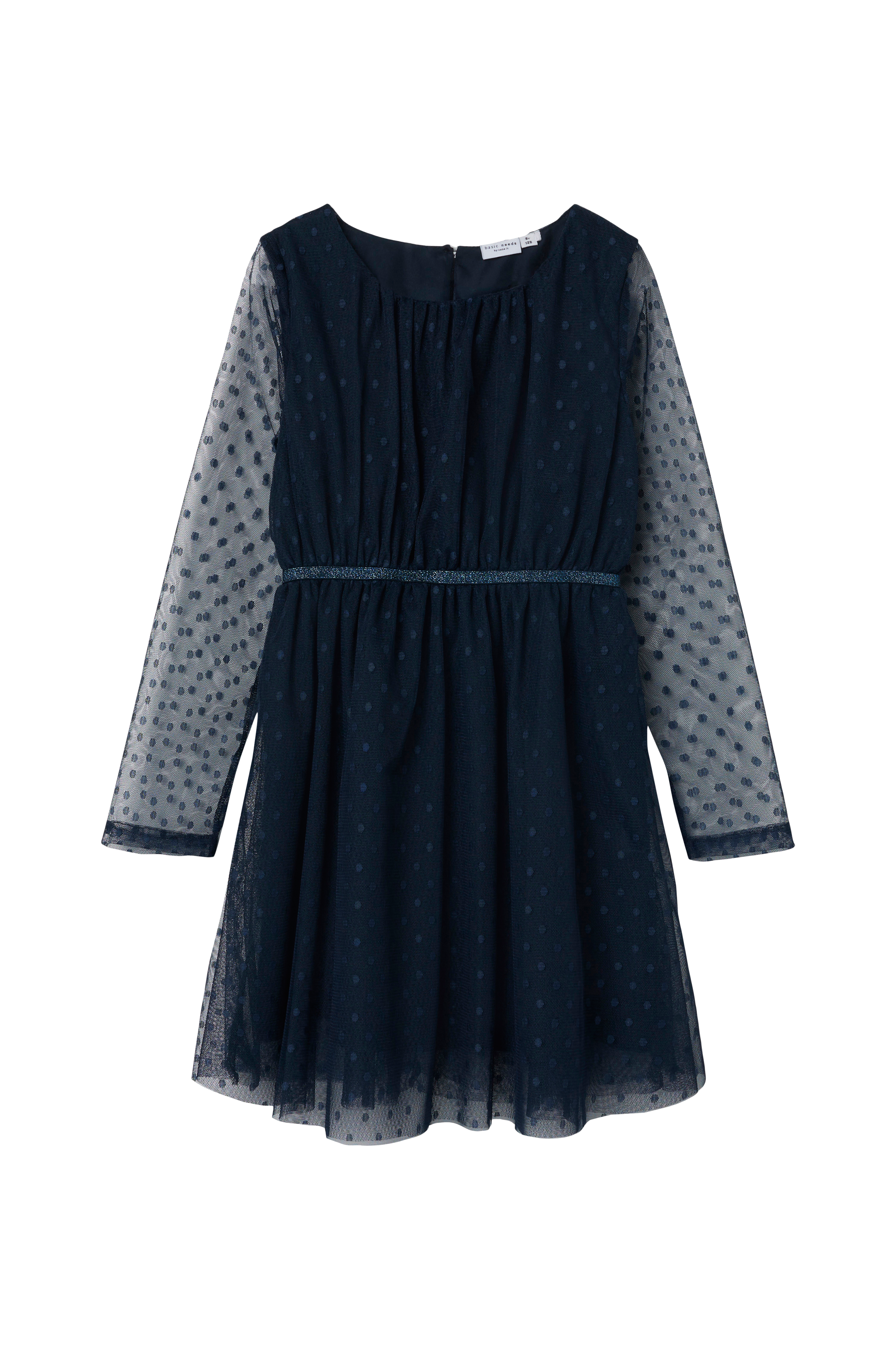 • Mønstervævet model i mesh• Rund hals med samling foran og knap i nakken• Defineret, elastisk talje• Langt ærme• Vævet for