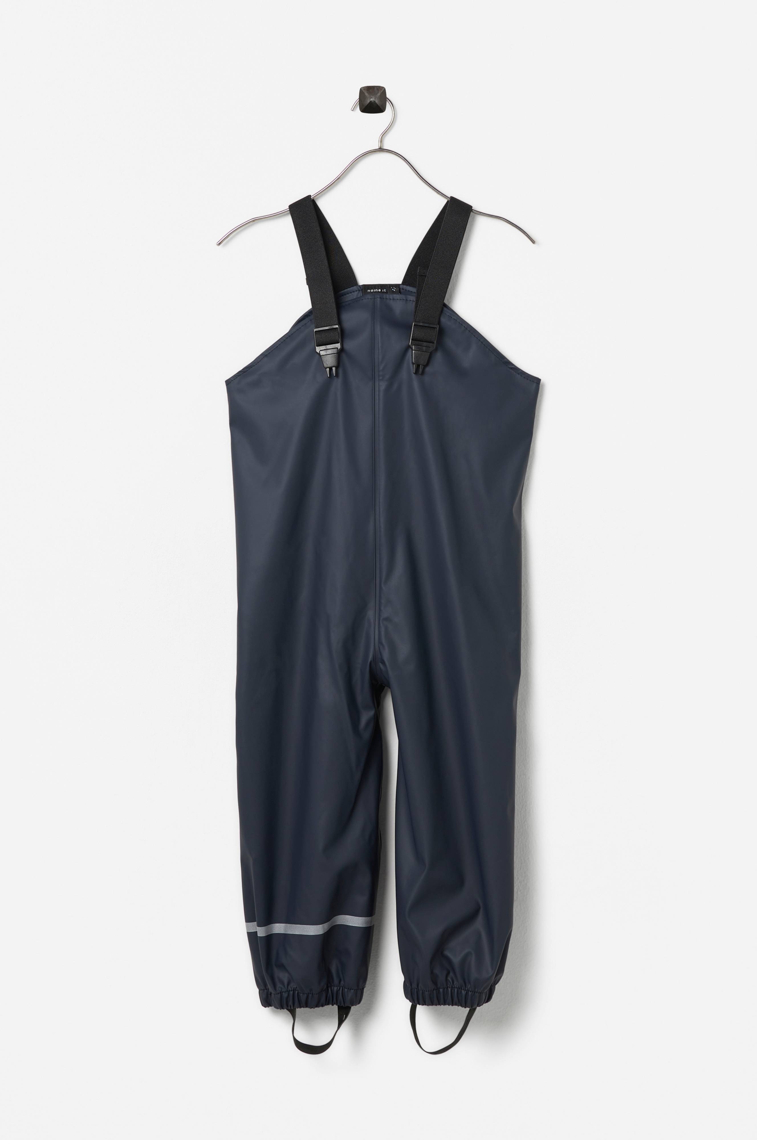 - Vindtætte, vandtætte regnbukser- Tapede sømme- Justerbare, elastiske seler i str. 92-104- Elastik i taljen (uden seler) i str. 116-164- Elastik bagpå i taljen- Elastik i benkanten- Aftagelige fodstropper- Refleksprint på det ene ben