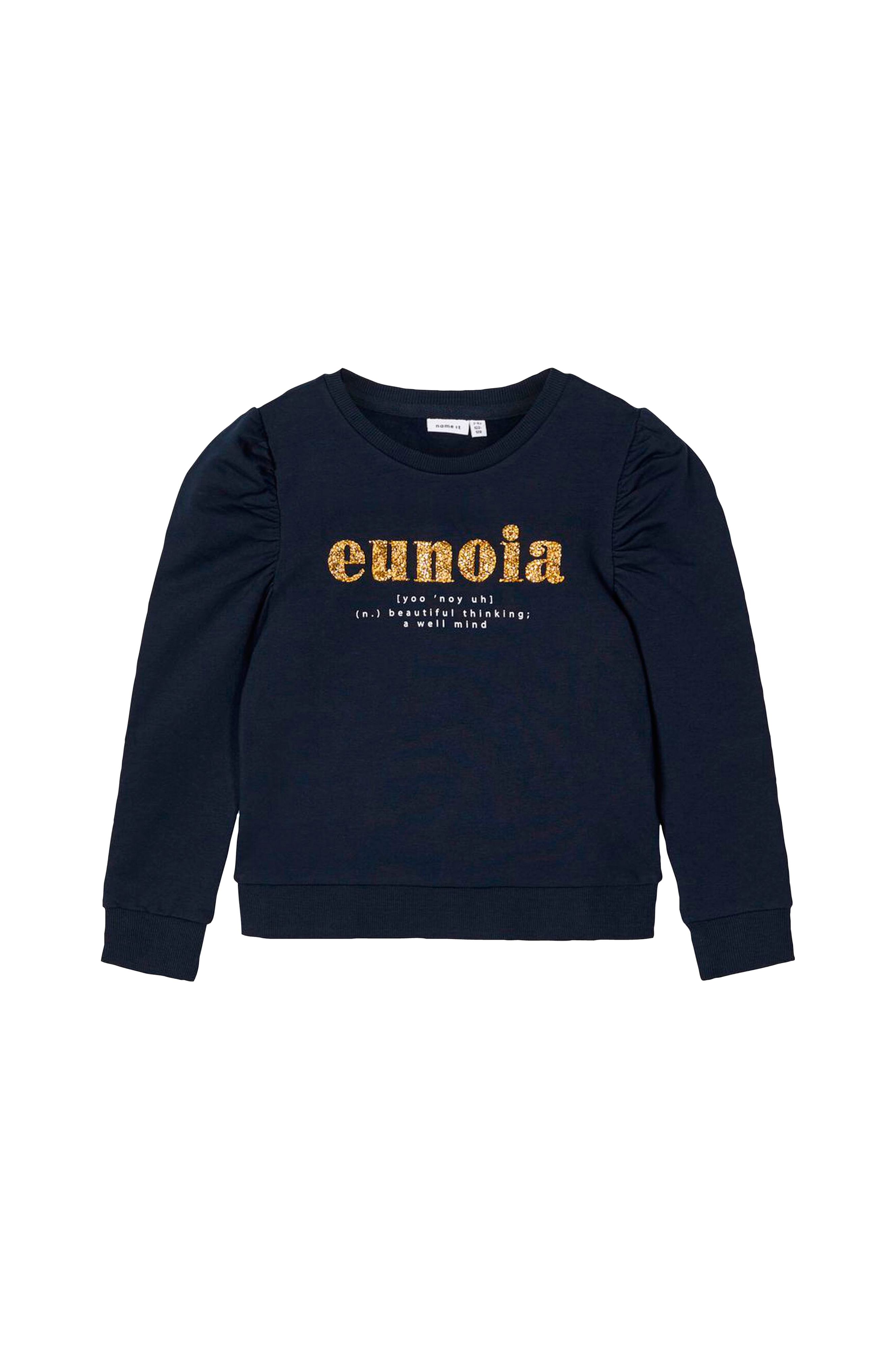 Sweatshirt nkfRike LS Sweat Bru fra Name it i økologisk bomuld med blød, børstet inderside og glitrende pailletapplikation foran. Pufærmer med rynket skuldersøm og ribkant i ærmekant, kant forneden og hals.