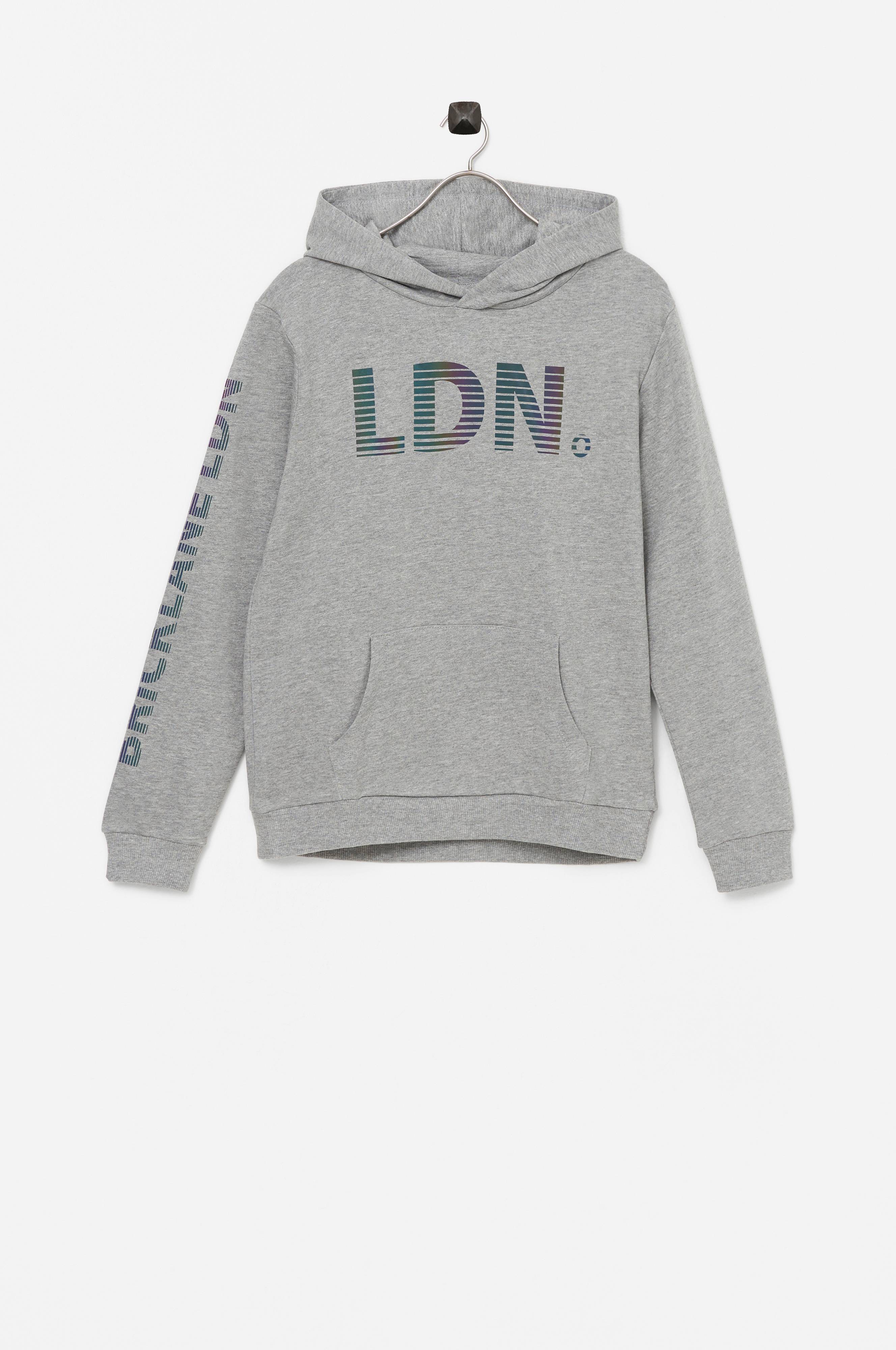 Lige model med print på brystet og på det ene ærme. Jerseyforet hætte og stor lomme på maven samt ribkant i kant forneden og ærmekant.
