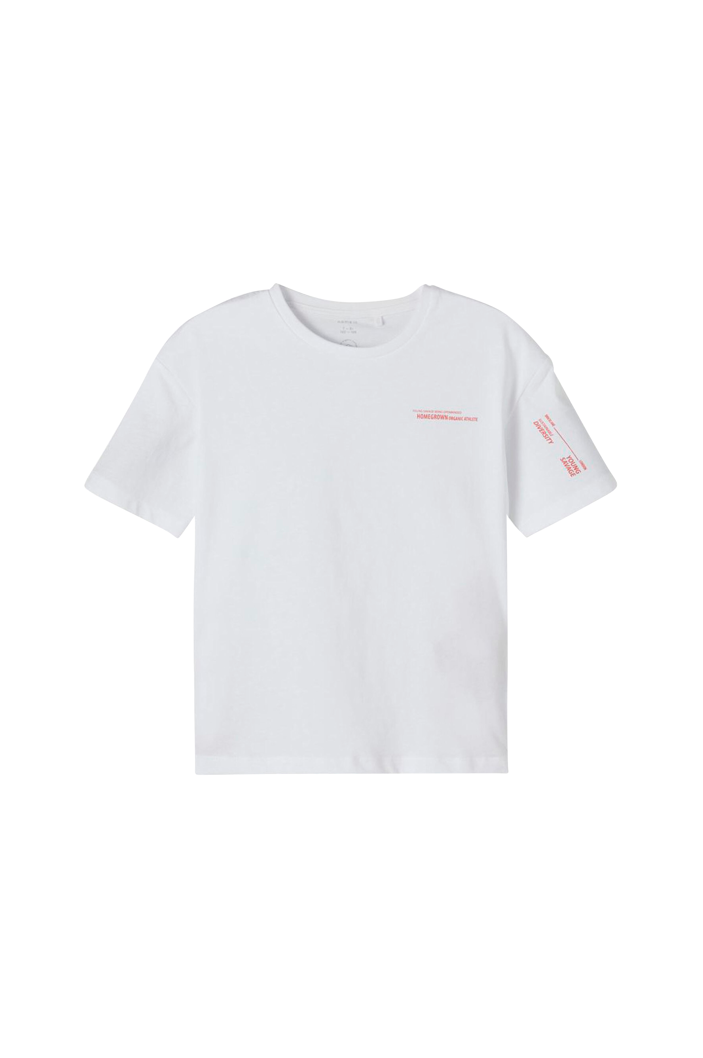 T-shirt af økologisk bomuld med lynlås forneden i den ene side. Printede detaljer på ærmer og på brystet. Rund halsudskæring med ribkant.