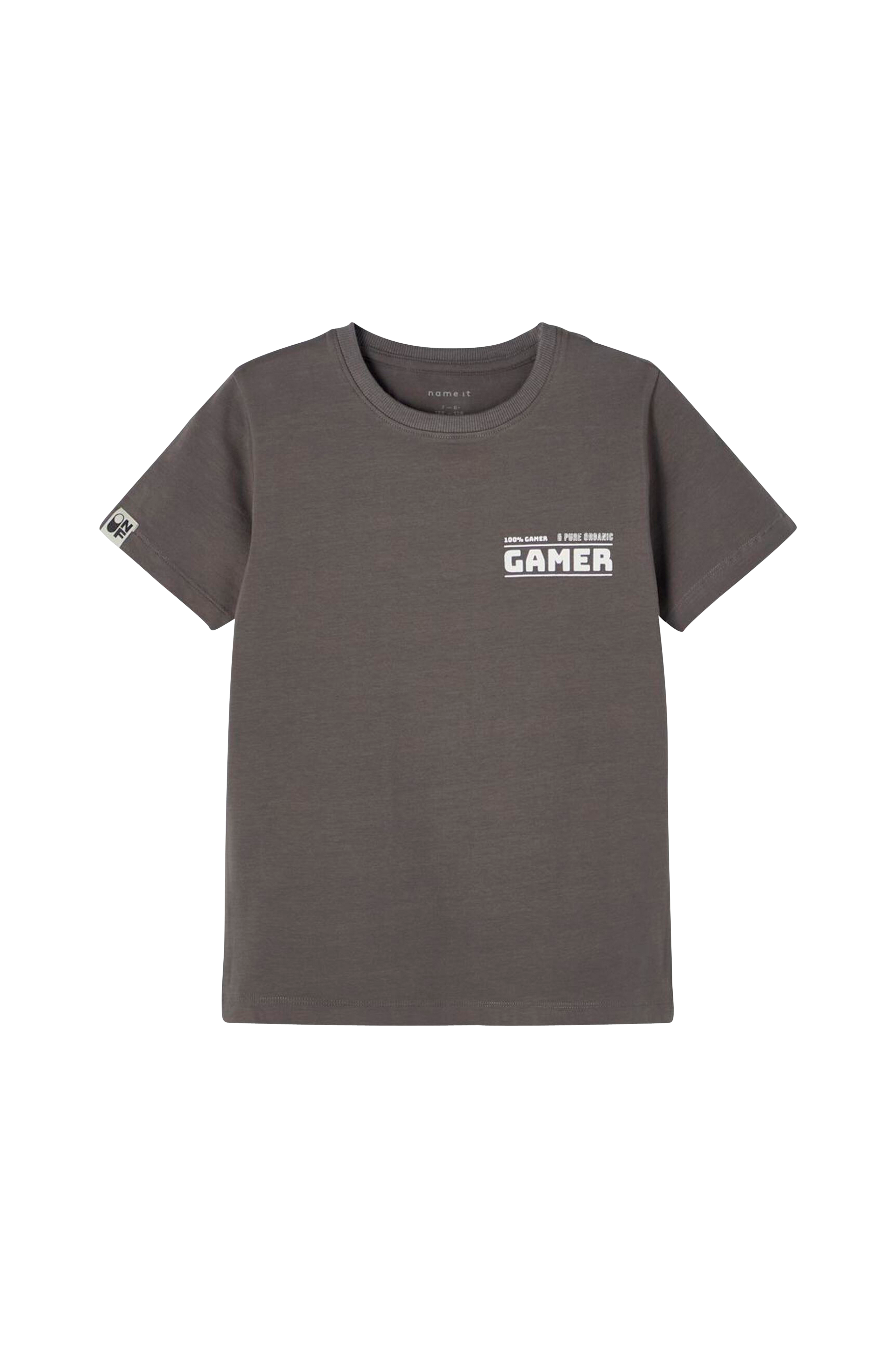 T-shirt med stort print på ryggen og et mindre print foran. Rund hals med ribkant.