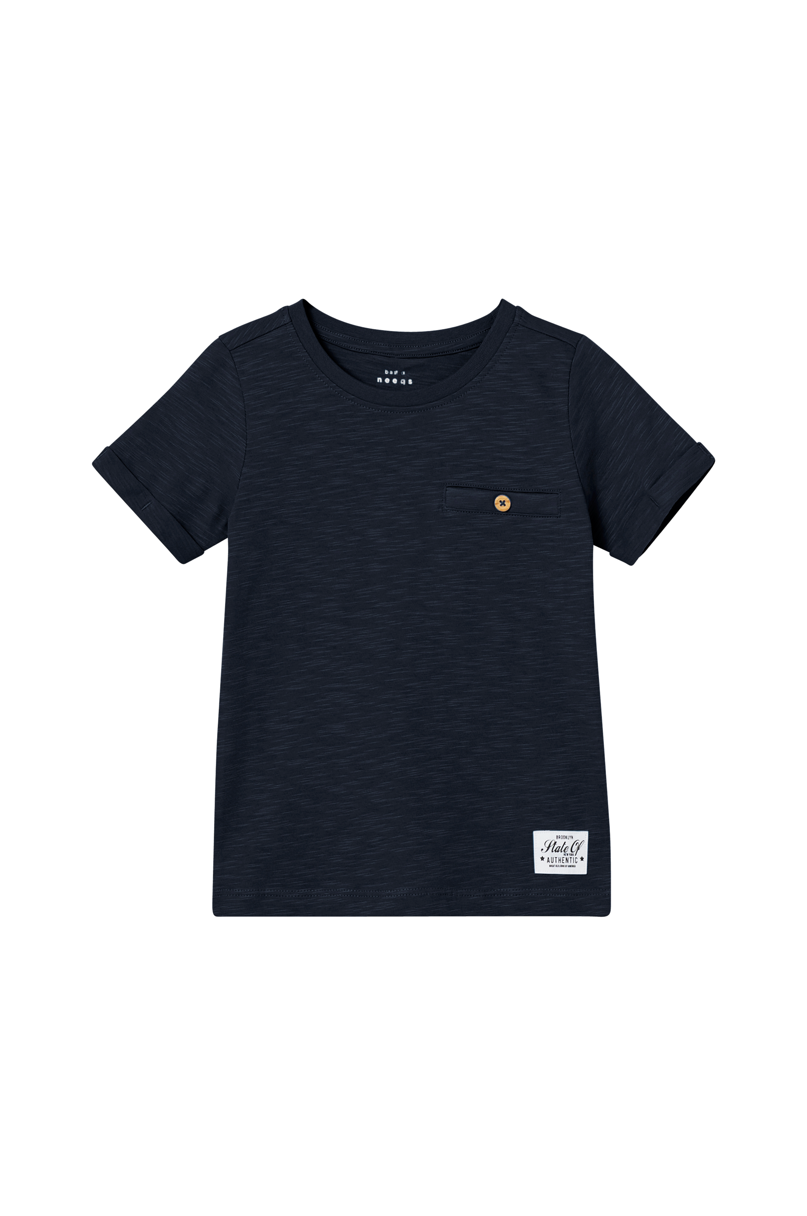 T-shirt i bomuld med slubstruktur i stoffet. Rund halsudskæring og en dekorativ knapdetalje på brystet. Opsyet ærmekant.