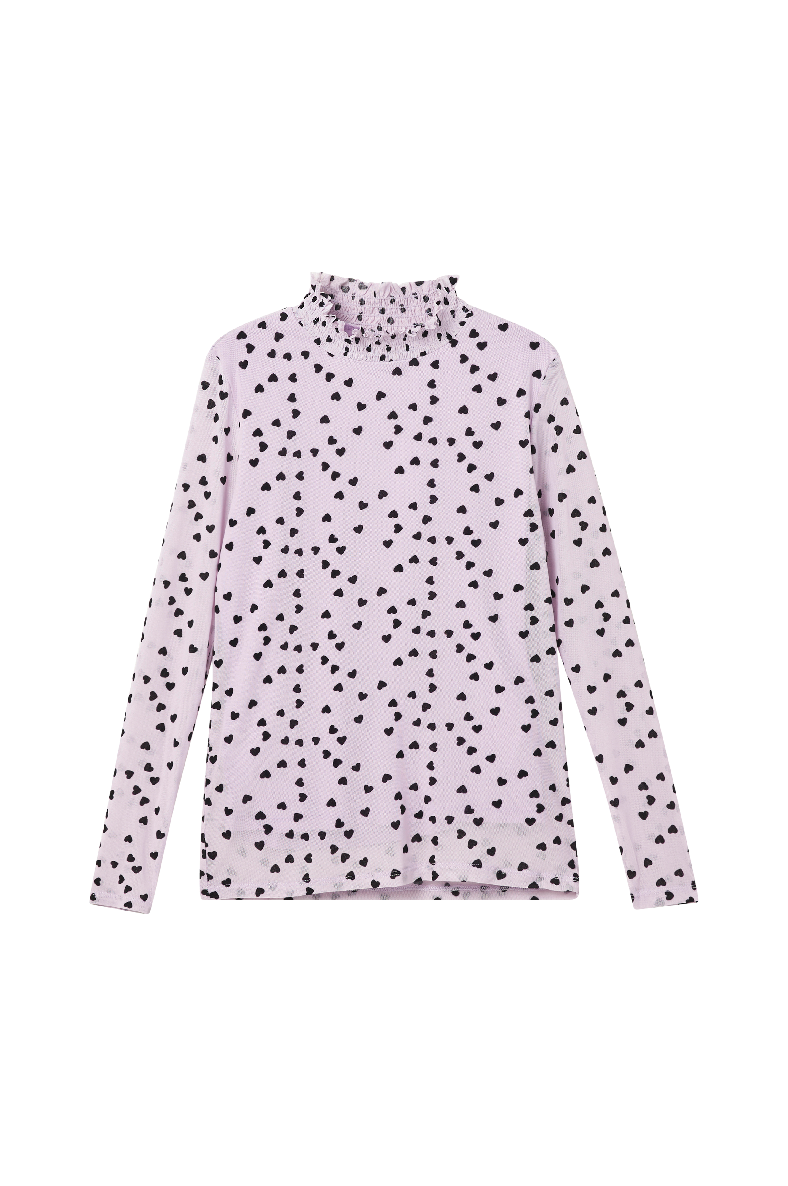 • Foret, langærmet top i mesh• Printede hjerter• Rund, smocket halsudskæring• Uforede ærmer