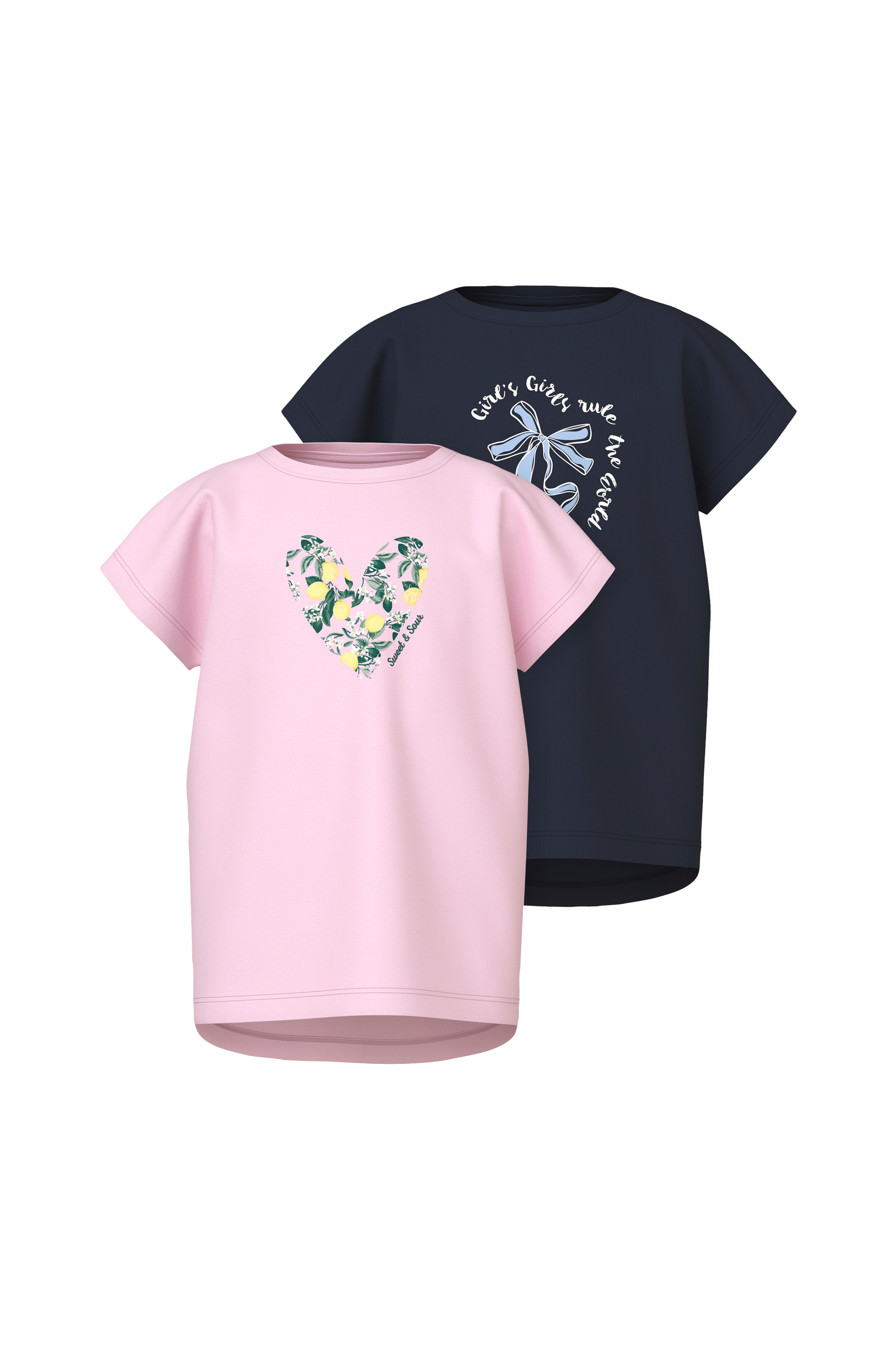 • To kortærmede toppe i bomuld• Rund hals• Tryk foran