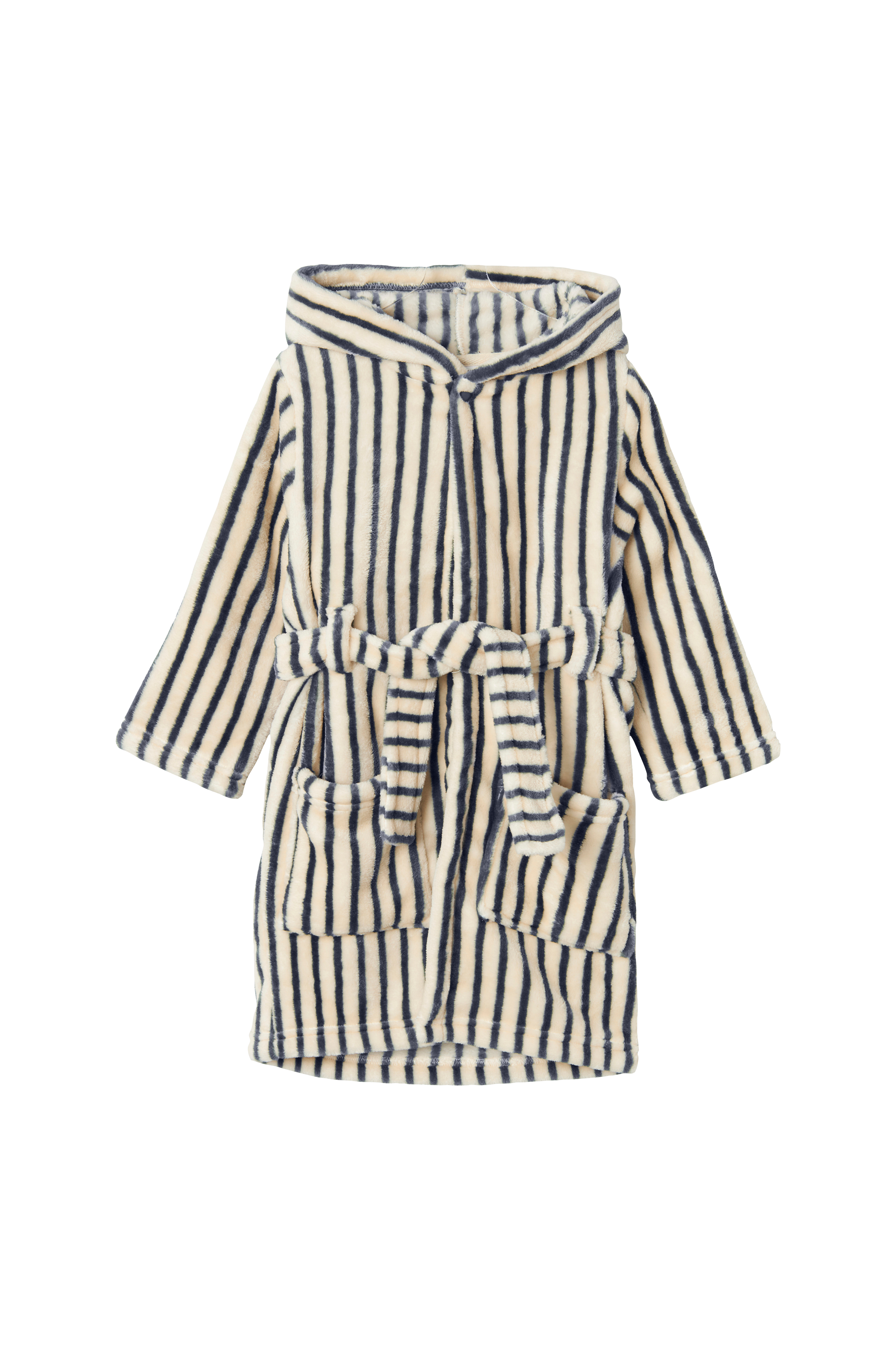 • Stribet badekåbe i blød velour• Hætte• Bindebælte• To lommer• Trykknap oppe foran