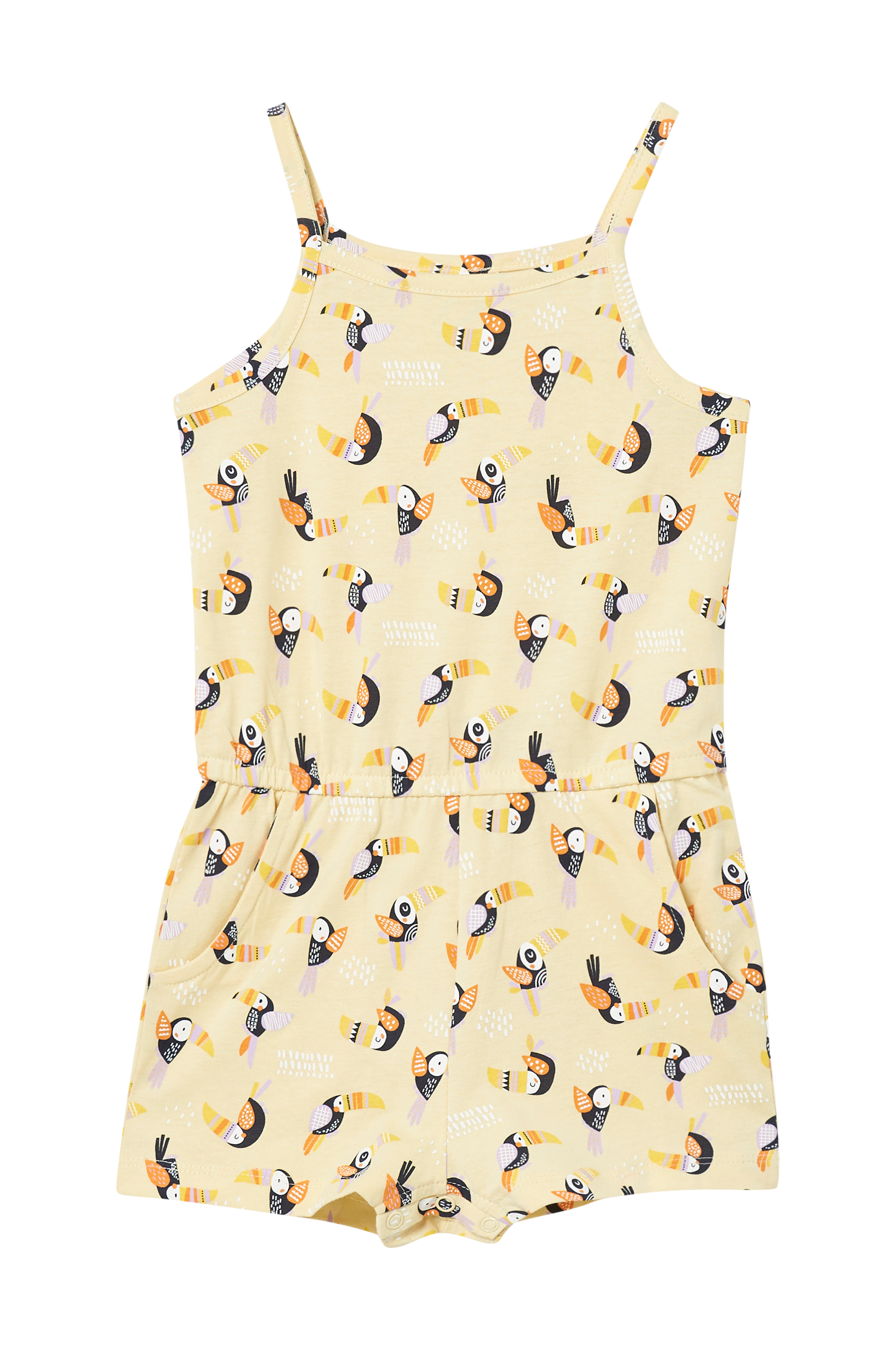 • Ærmeløs buksekjole med tynde skulderstropper• Elastisk bånd ved taljen• Korte ben• To lommer