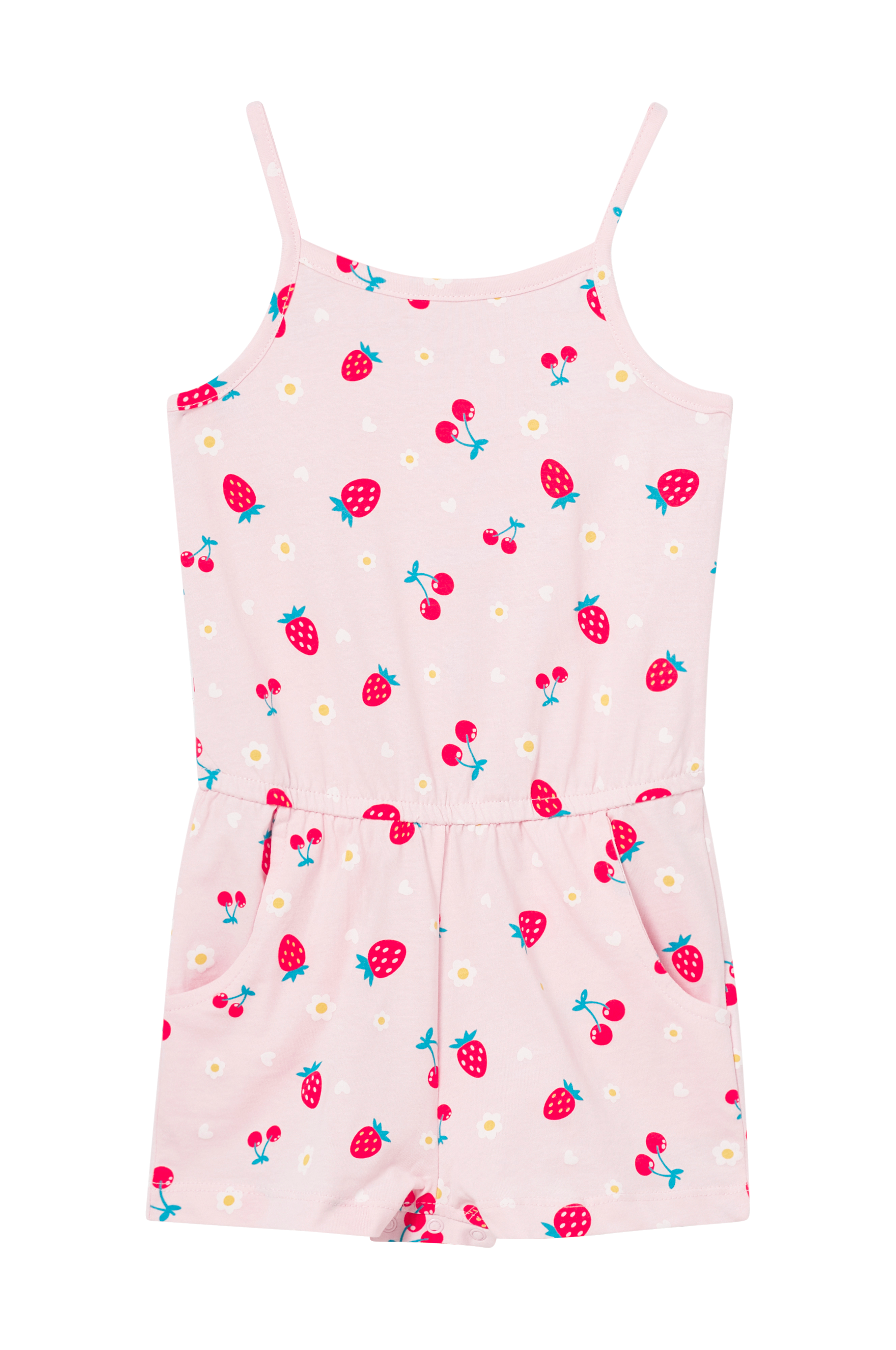 • Ærmeløs model med korte ben• Tynde skulderstropper• Elastik ved taljen• Lommer foran• Trykknapper ved skridtet