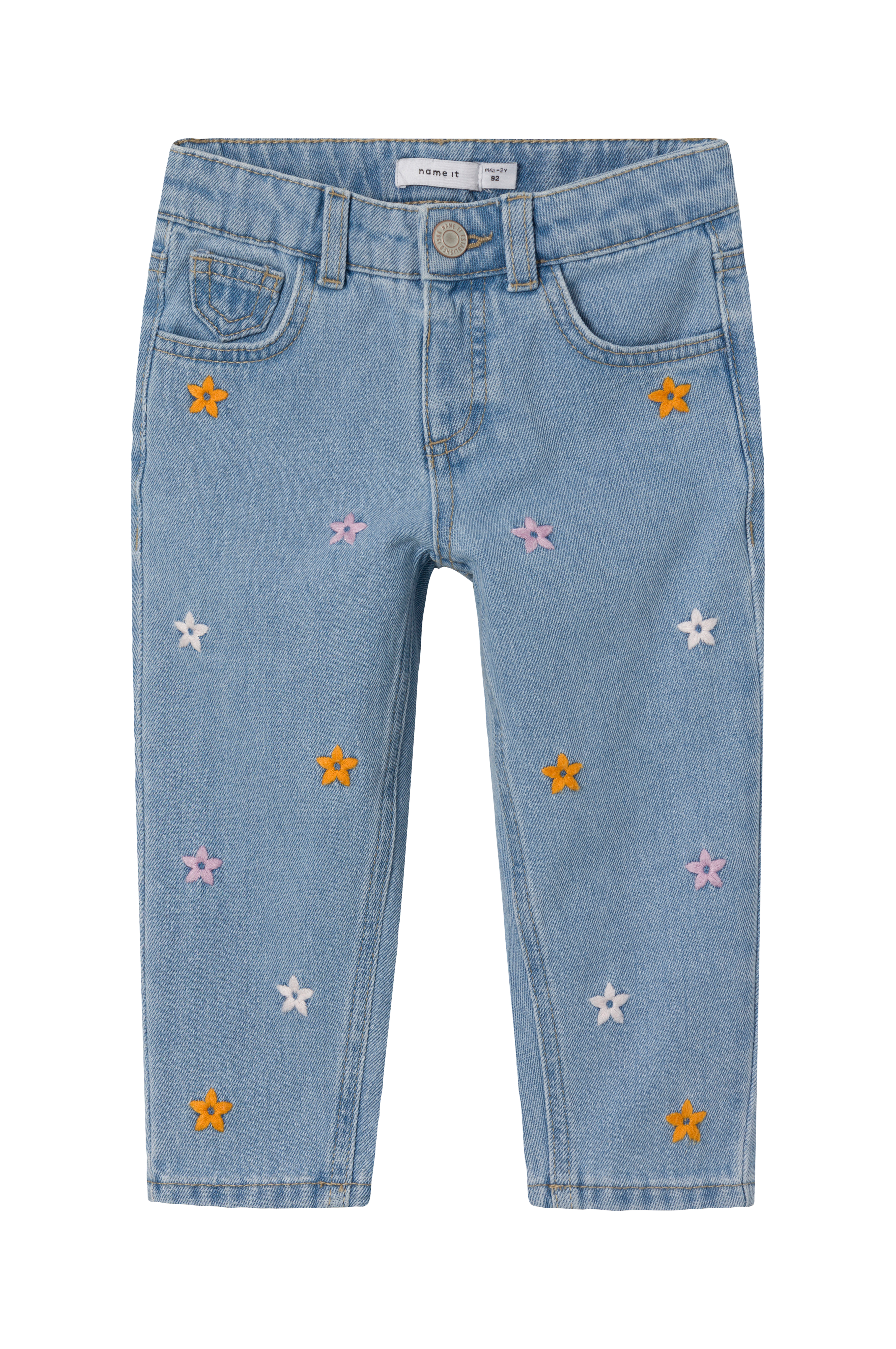 Jeans med broderede detaljer foran på benene. Regulerbar talje og lukning med trykknap. 5-lommemodel. Baggy pasform foroven og smalle ben.