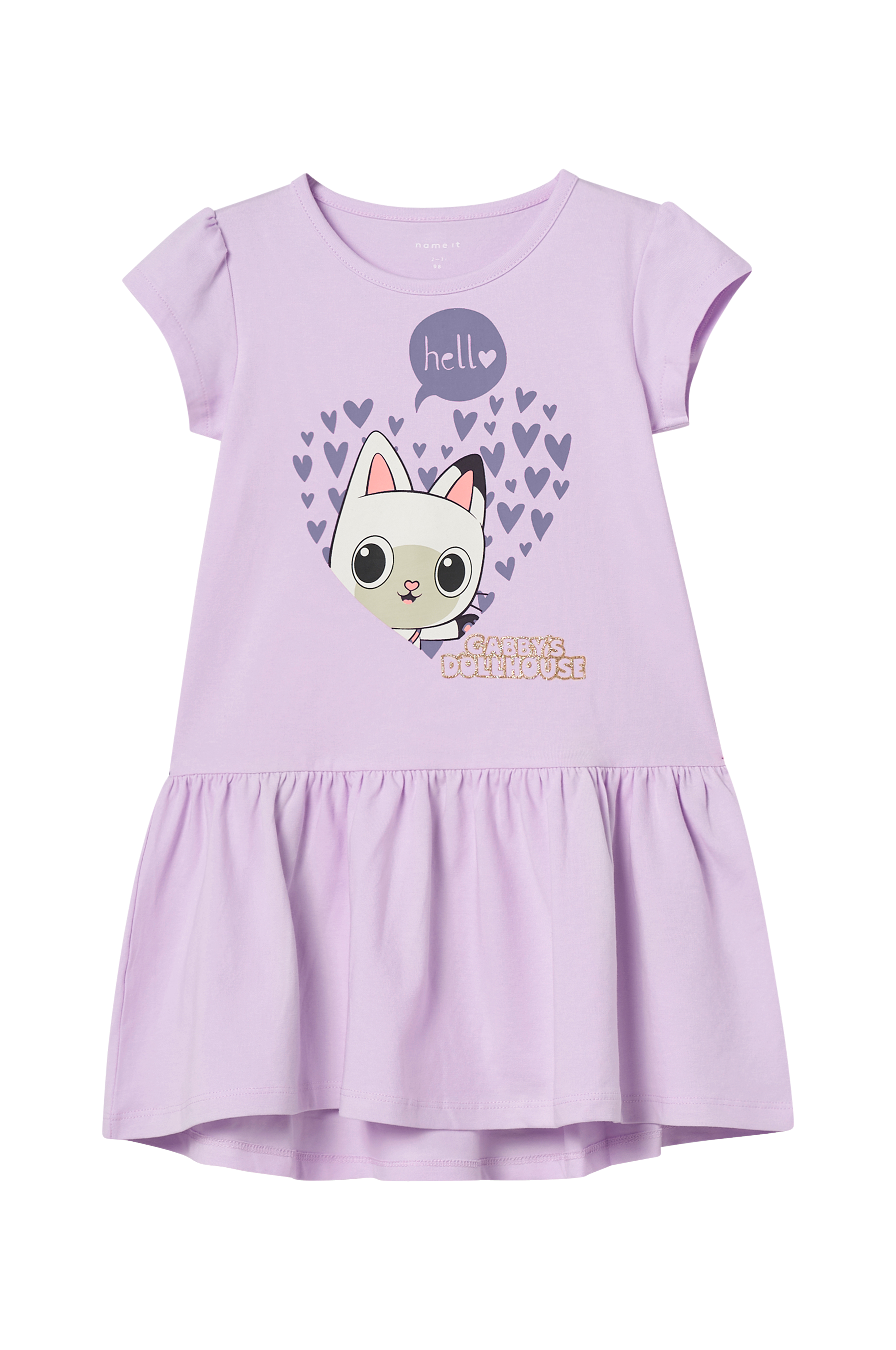 • Fremstillet af blød, elastisk bomuldsjersey• Rund halsudskæring• Kort ærme• Tryk foran med glitrende detalje• Elastisk bånd ved taljen med samling