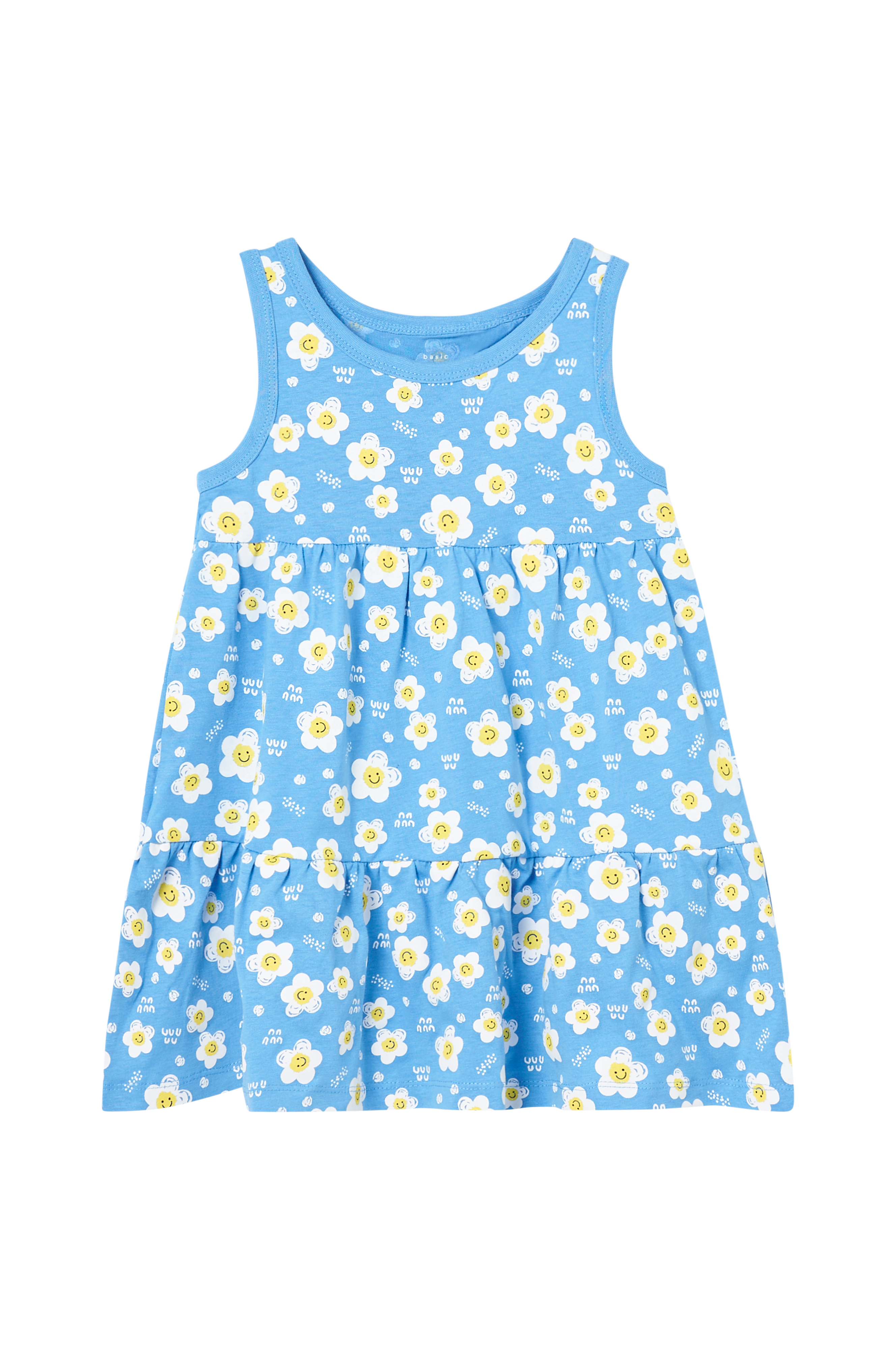 • Ærmeløs kjole• A-linje design• Volanter• Fremstillet af bomuldsjersey