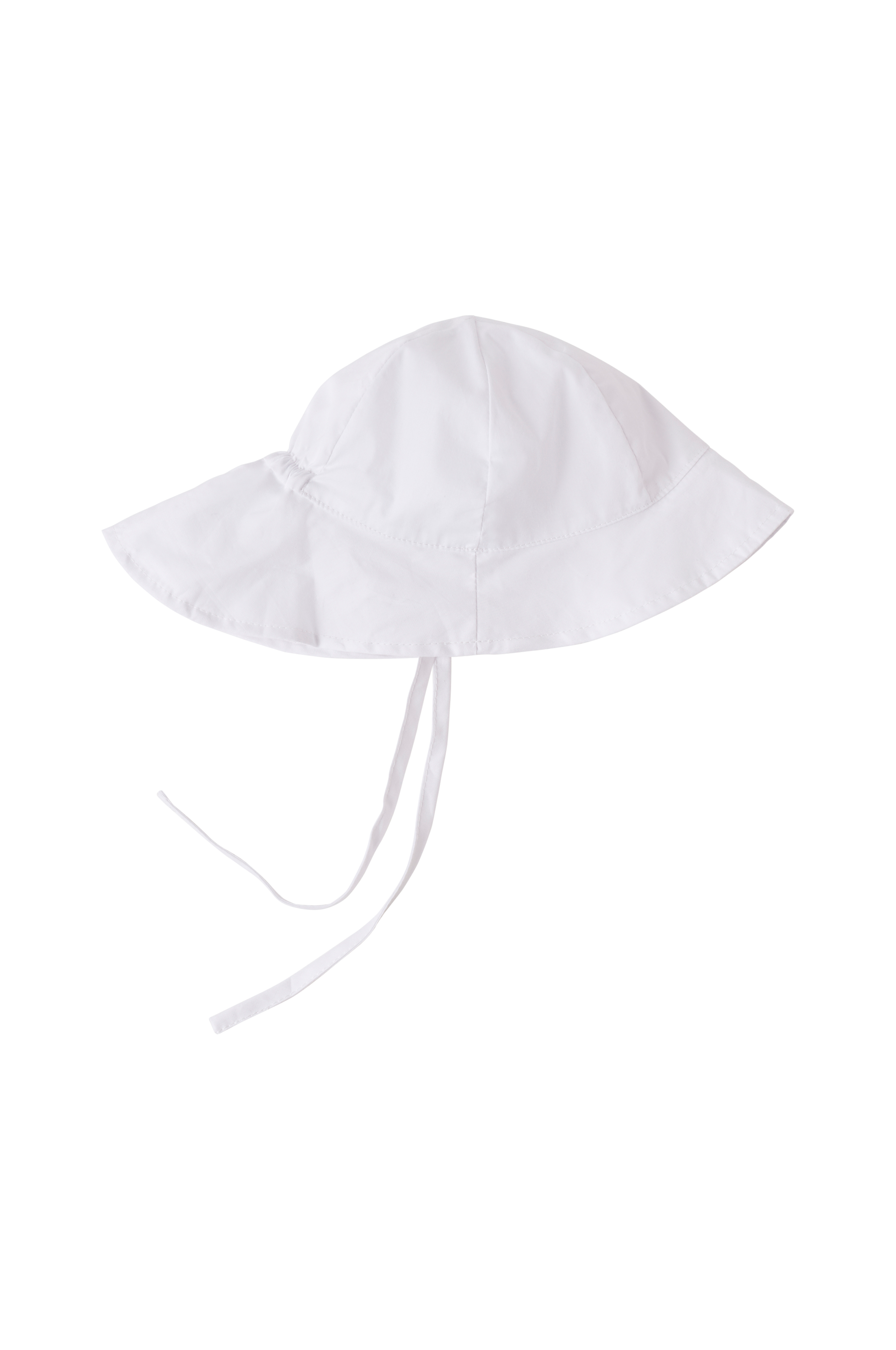 Solhat med solbeskyttelse i bomuld som bindes under hagen. Solbeskyttelsesfaktor UPF 50+.