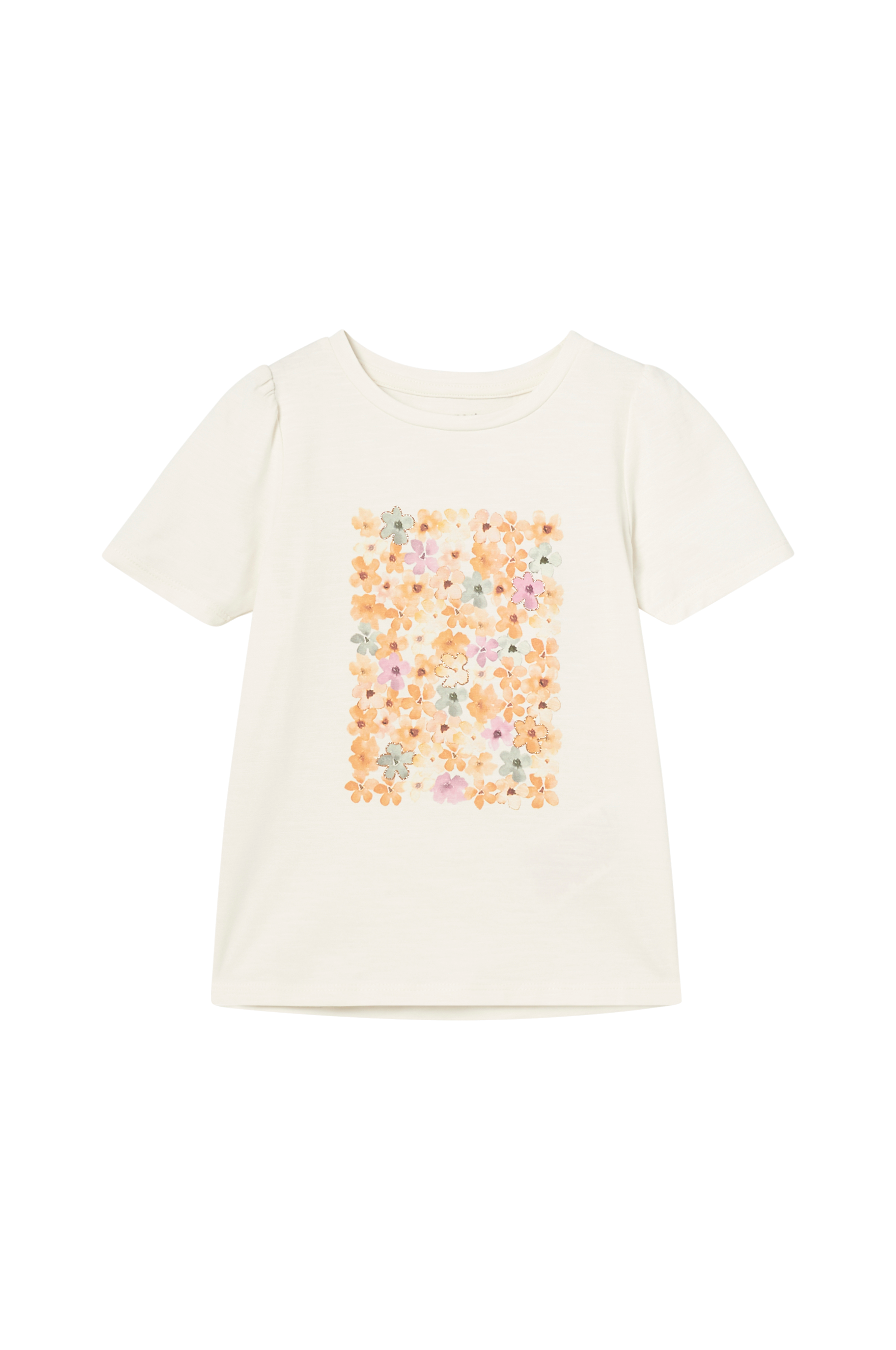 • Fremstillet af blød, elastisk bomuld• Rund halsudskæring• Glitrende tryk foran• Korte ballonærmer