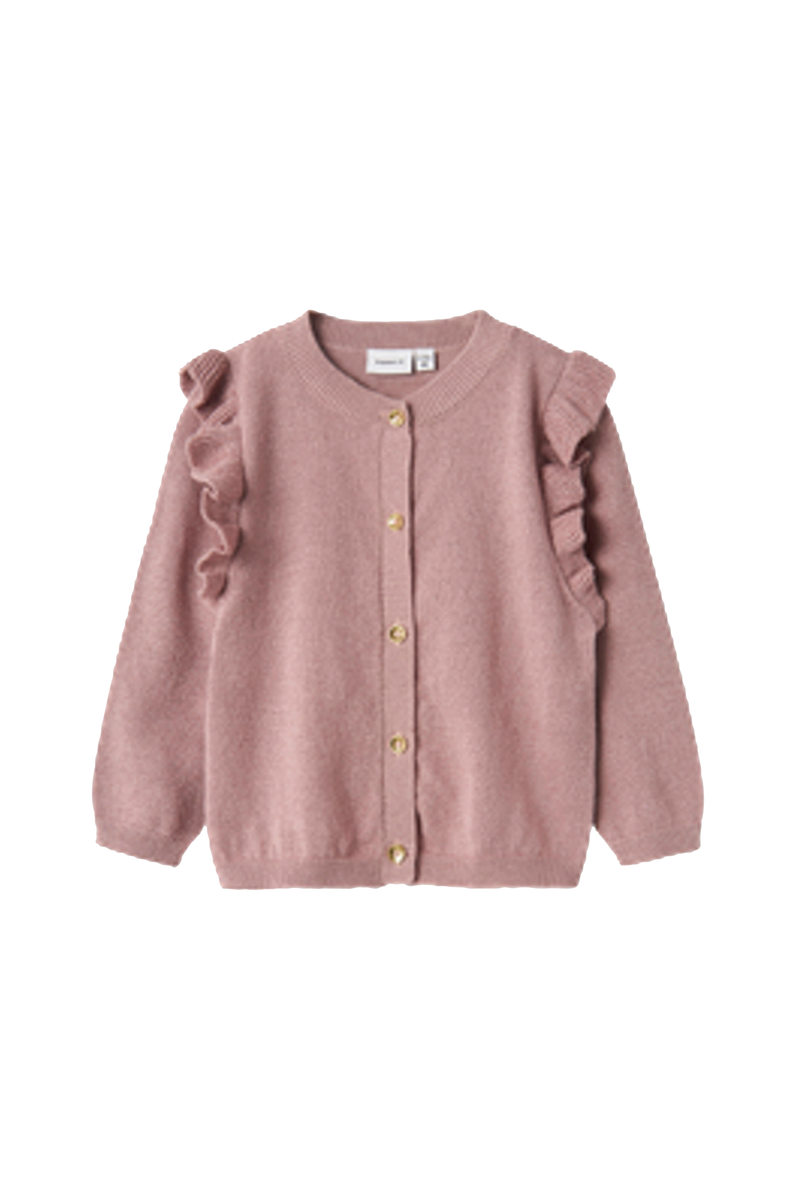 • Fintstrikket cardigan med glimmertråd• Rund, ribstrikket halsudskæring• Knapper foran• Volant omkring skuldrene• Ribstrik ved manchetterne og ved nederste kant